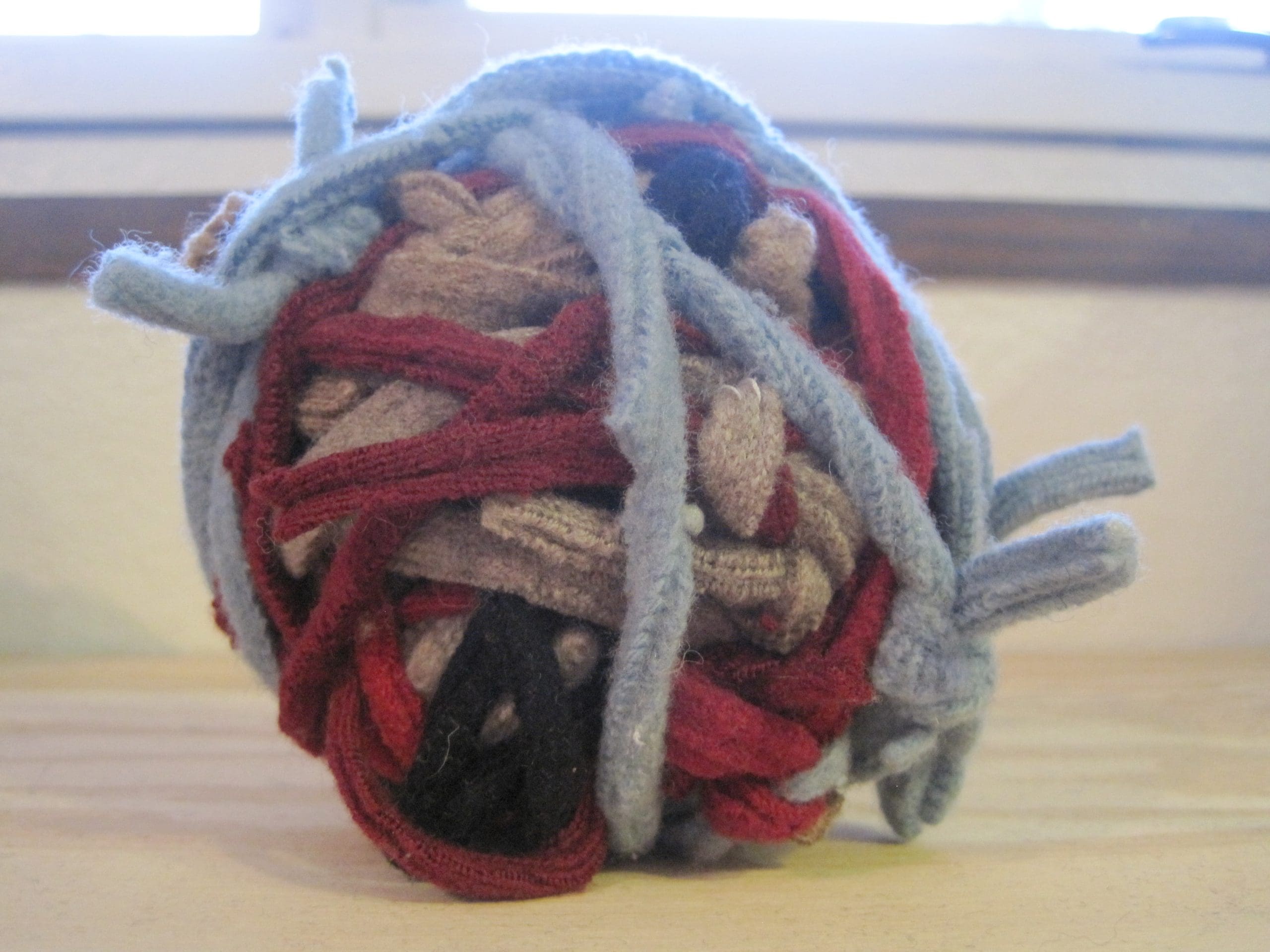 These are the seams from felted sweaters. At first I threw them away, but the more I thought about it, the more I thought–there has got to be a use for these things, so I began saving them. I tied them end to end and rolled them into balls. I used them for ribbon on Christmas presents this year which I thought was a nice folksy touch.