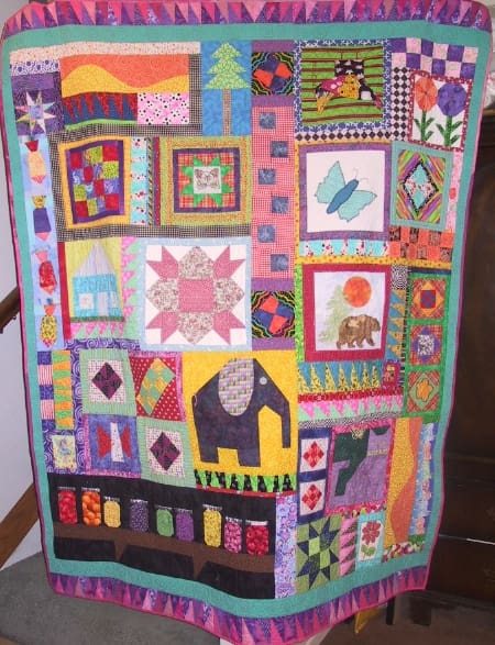 Here is the finished quilt. This is the only one of these quilts that have a block made by me–I am the owl in the left corner. I love how it turned out.