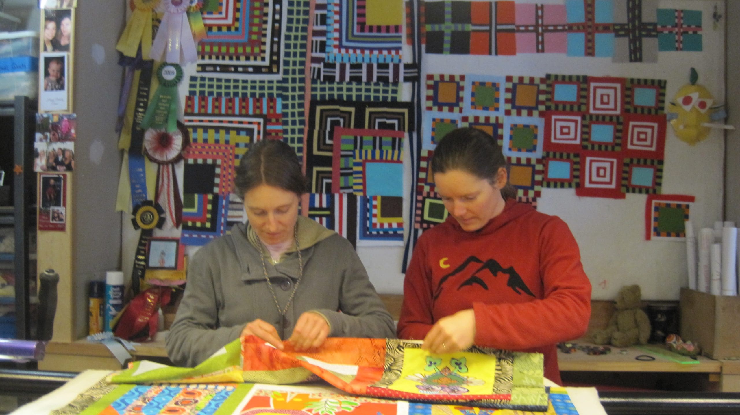 I like to host a quilting party. I prep dozens of fat quarters by ironing a fusible adhesive (usually wonder under) to the wrong side of each piece of fabric. I arrange all of these pre-fused fabrics by color and place them in the center of the table where everyone can get to them. I then prep background fabrics for everyone to use as their base fabrics. Friends and family show up for snacks and drinks and make their blocks. To make these blocks all you need to know how to do is cut with scissors. If I know someone who wants to make the quilt, she then takes the blocks and makes it into a quilt top. From there she quilts it, or I do. Here is a photo of all the fabric ready to be used by members of the community. I wish I had more photos of real action, but when I do this, I am working and don’t have time to take pictures!