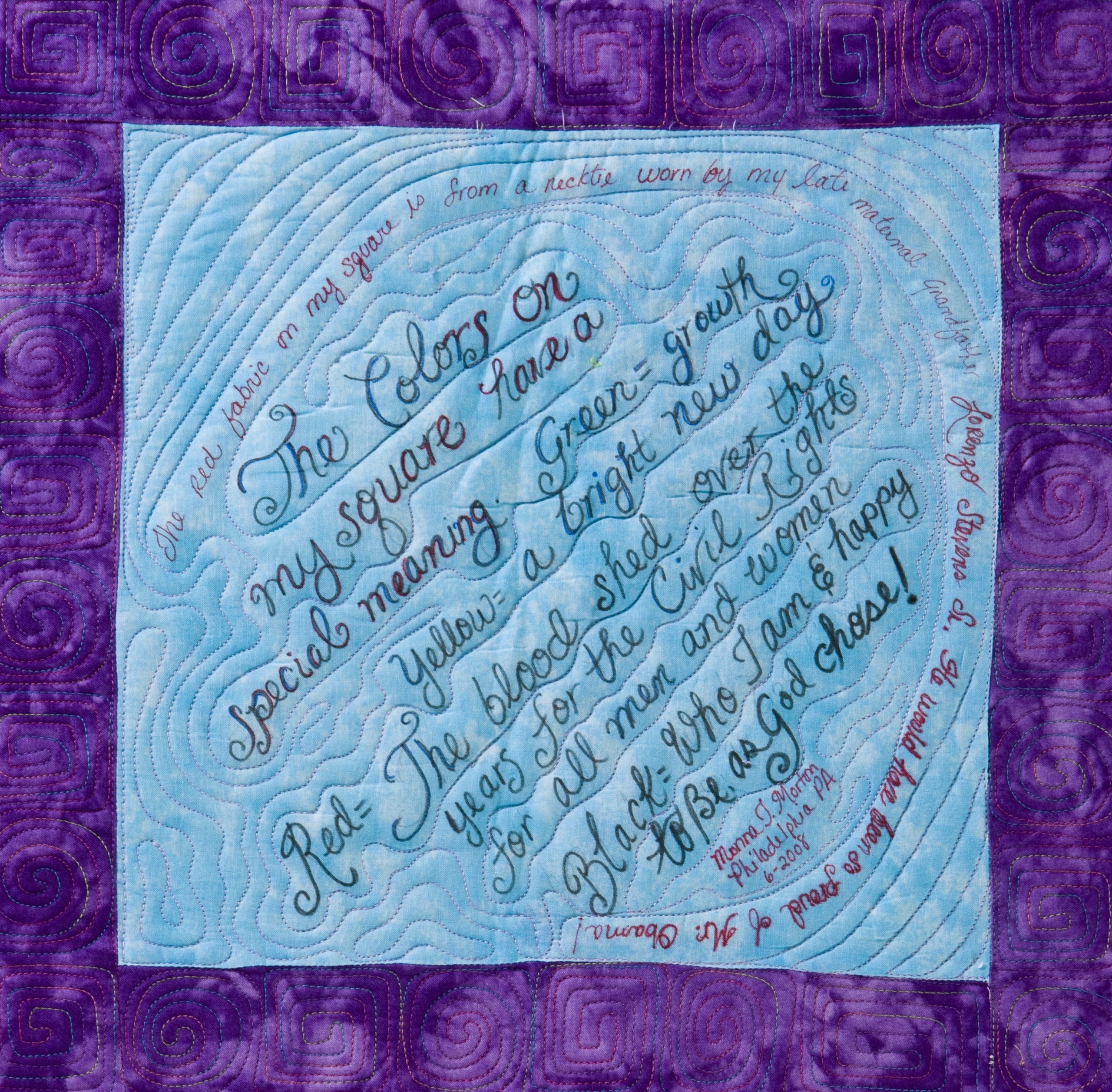 I got the quilt and realized it needed a special border to tie all the different blocks together. One of my favorite aspects of this quilt is that it stitches women from all different backgrounds, geographic locations, and artistic talents all together in one quilt. For me, that is one of the great joys of community quilts.