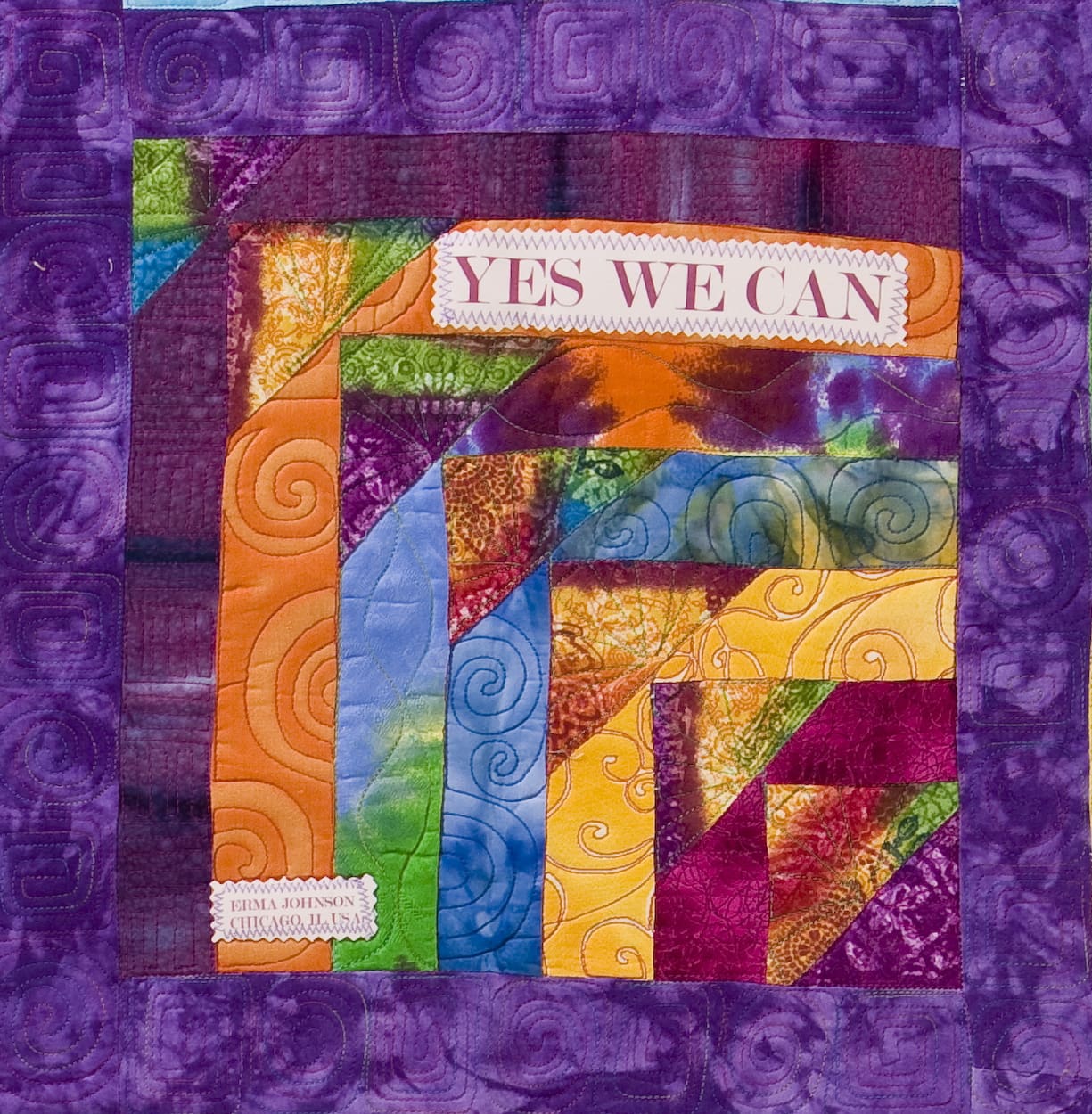 Well, the sweater will be finished this weekend. So today is the day I share the story of the Yes! We Can quilt made by the Fiber Artists for Obama.