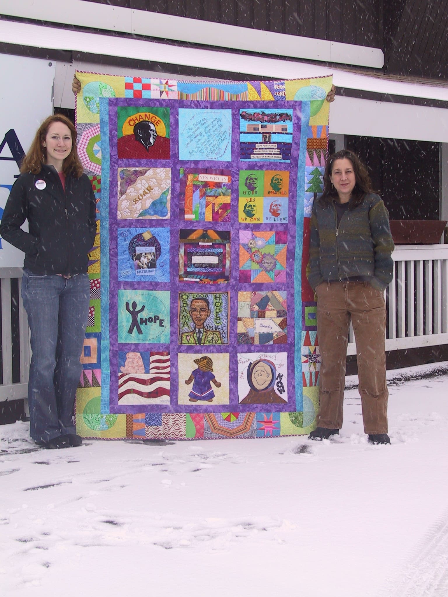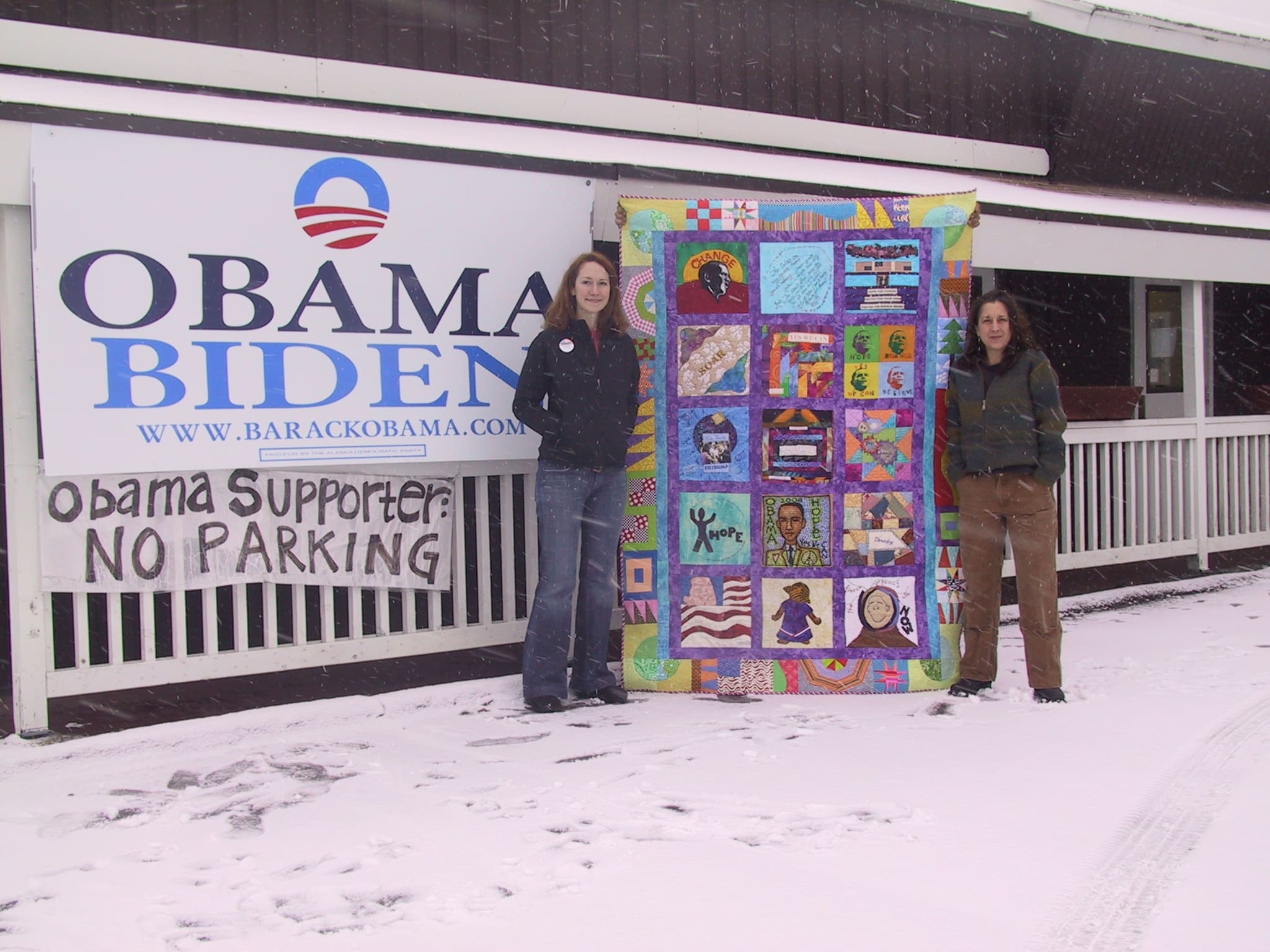 Once the quilt was completed, I headed down to the Obama headquarters in Anchorage, Alaska to show the quilt off. It was October and snowing ,but the campaign manager and I proudly displayed the quilt outside the headquarters.