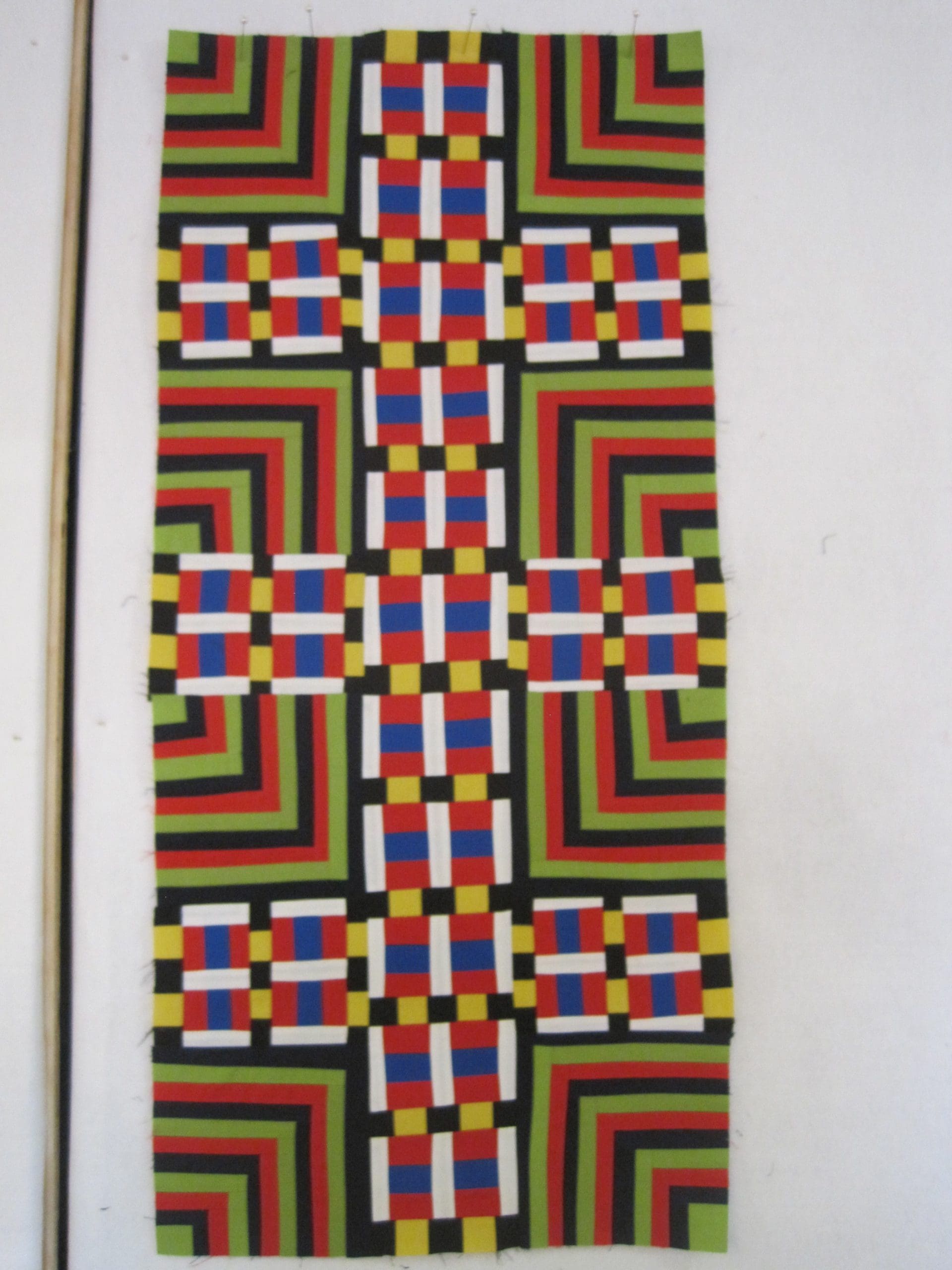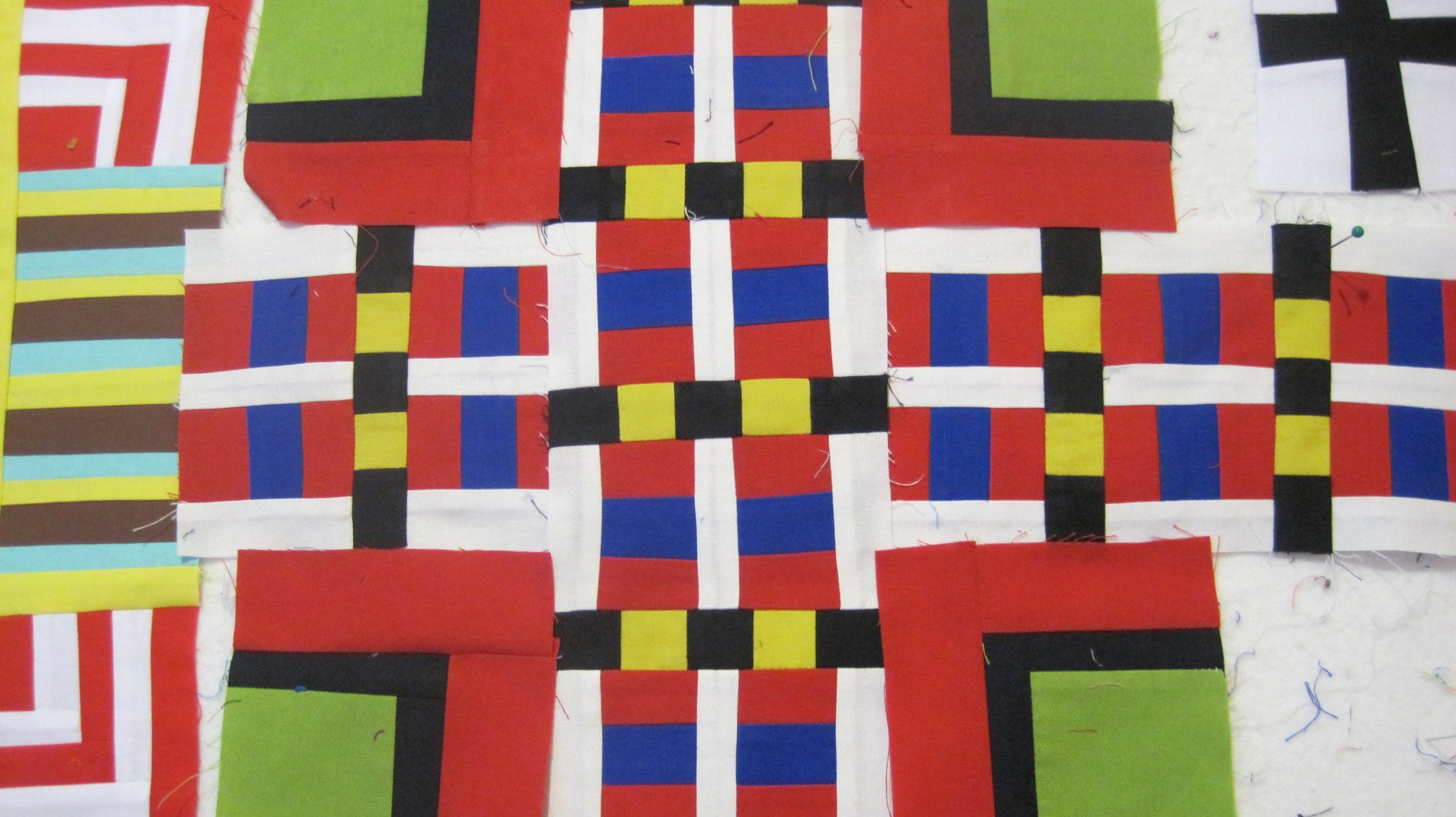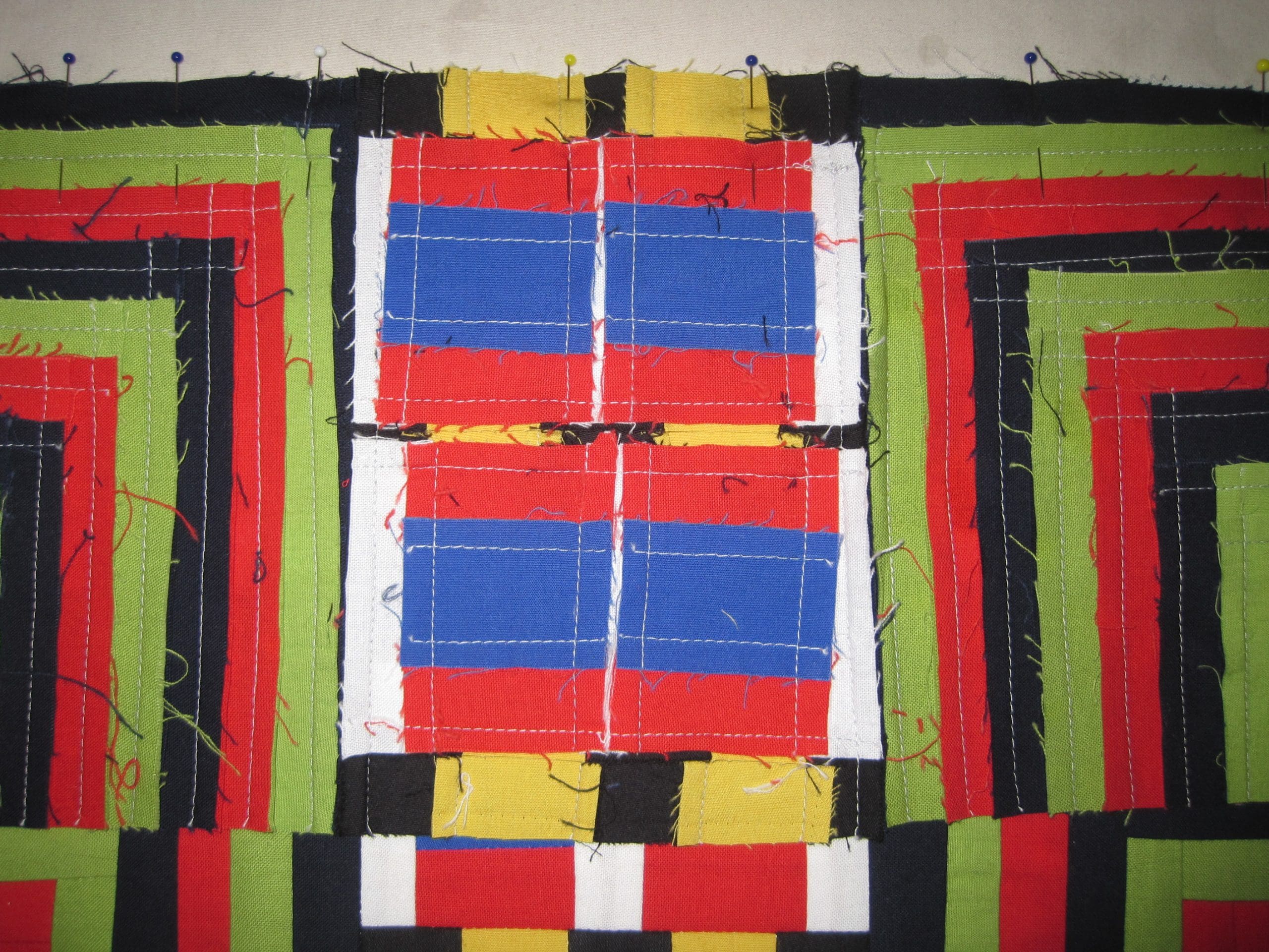 Technotronic first showed up in the spring of 2011. I was just beginning to make Color Grid quilts. In all honesty, I did not know that I was on my way to making a series of quilts–I was just doing what I always do which is throw stuff up on the design wall and see what happens. In the beginning, Technotronic was trying to make its way into the quilt Dance Party at Tamara’s House, but it didn’t make the cut. Or maybe I decided it really did deserve to be its own quilt. I should take better notes.