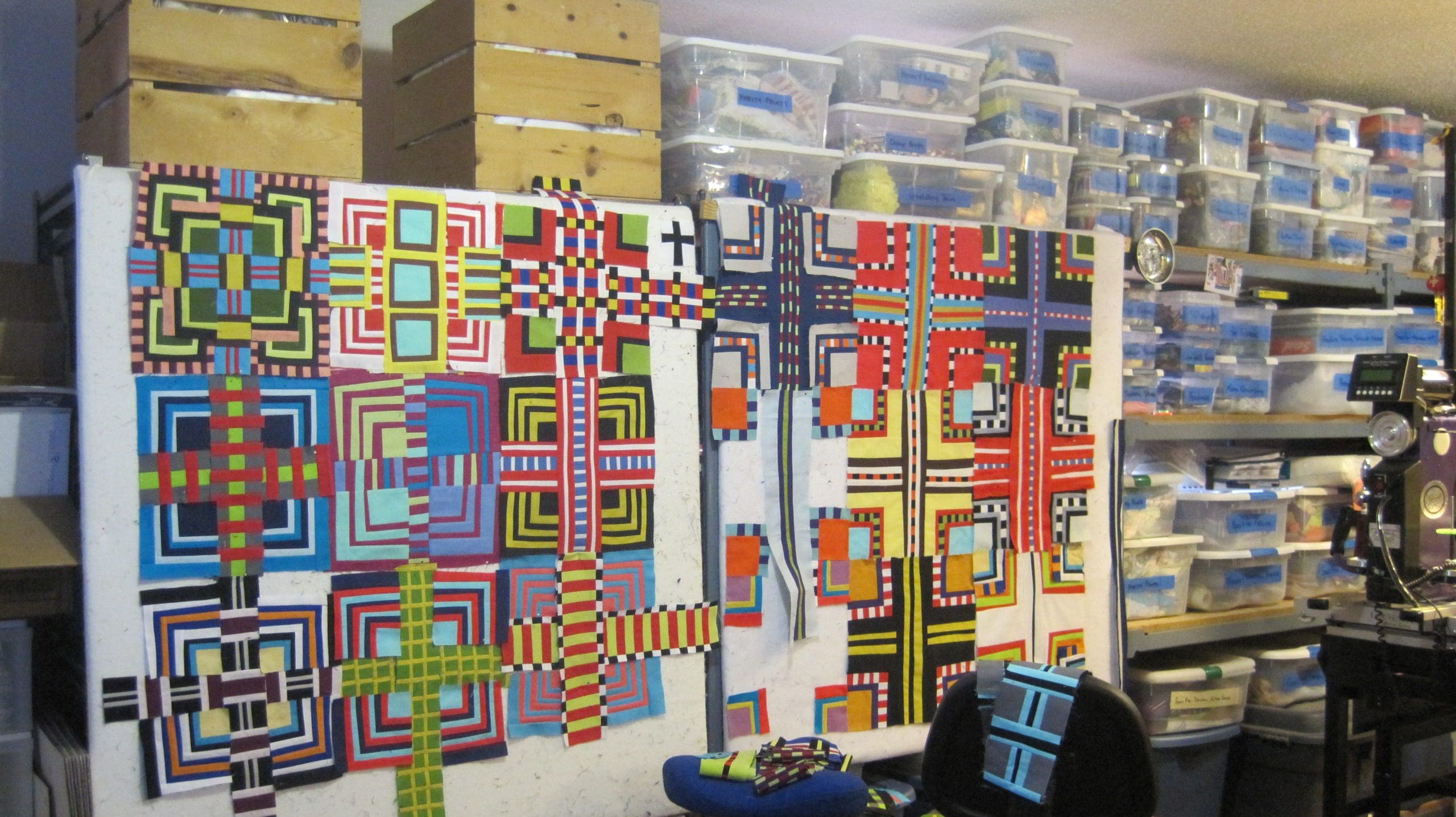 Here is what is on the other design walls. I am always kind of surprised at what quilts are started together and then what quilts actually get finished. Everything surrounding Technotronic has actually been finished.