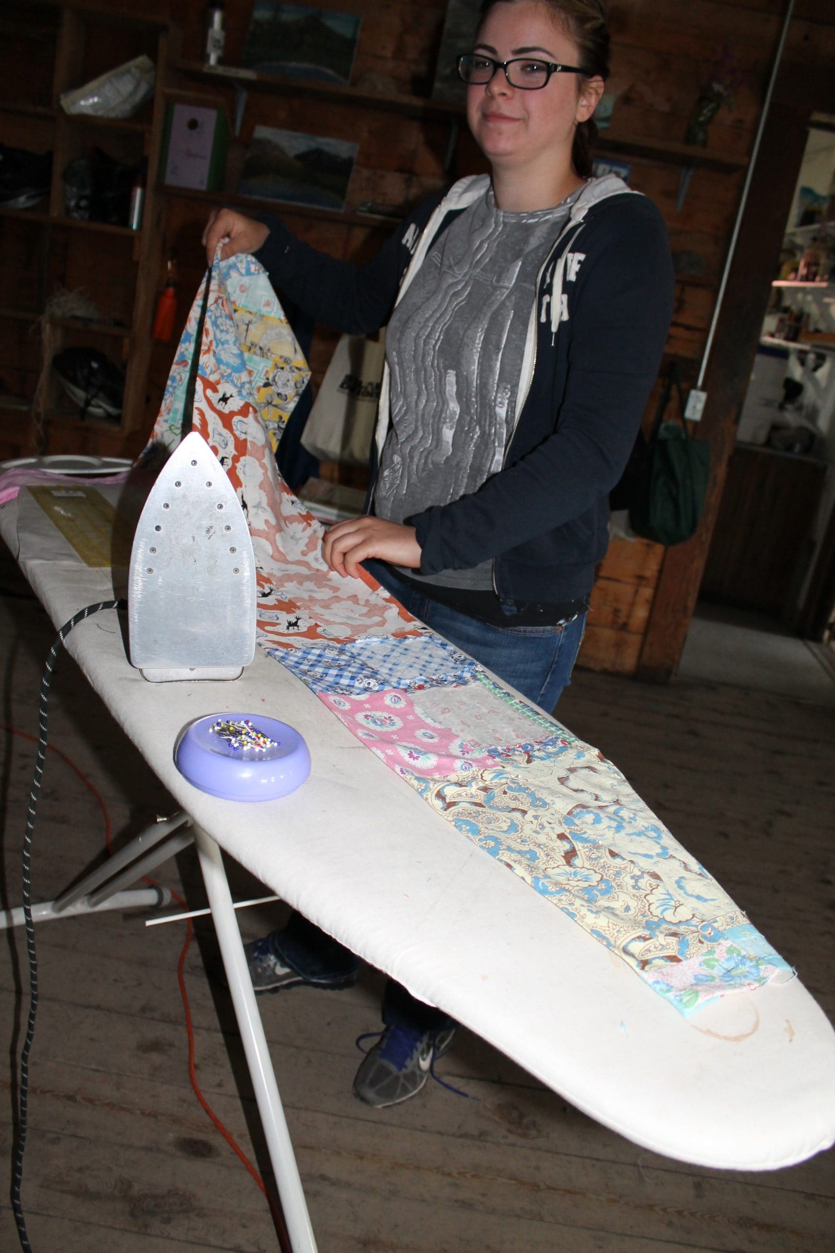 Andrea at the ironing board making curtains for her grandmother’s 1920’s cabin in downtown McCarthy.