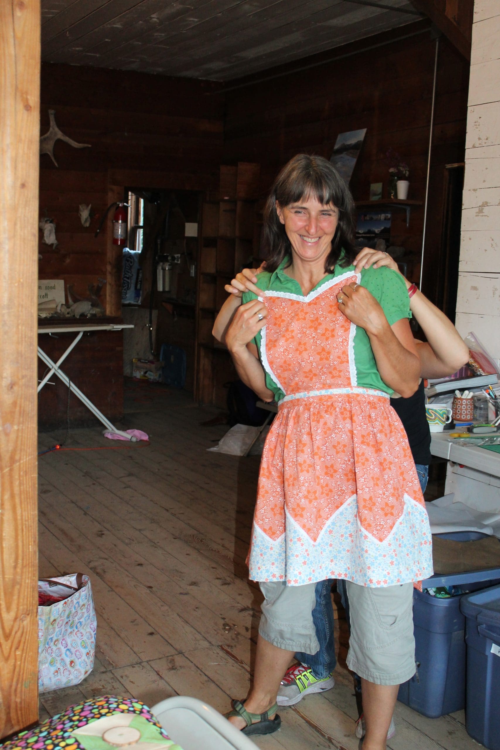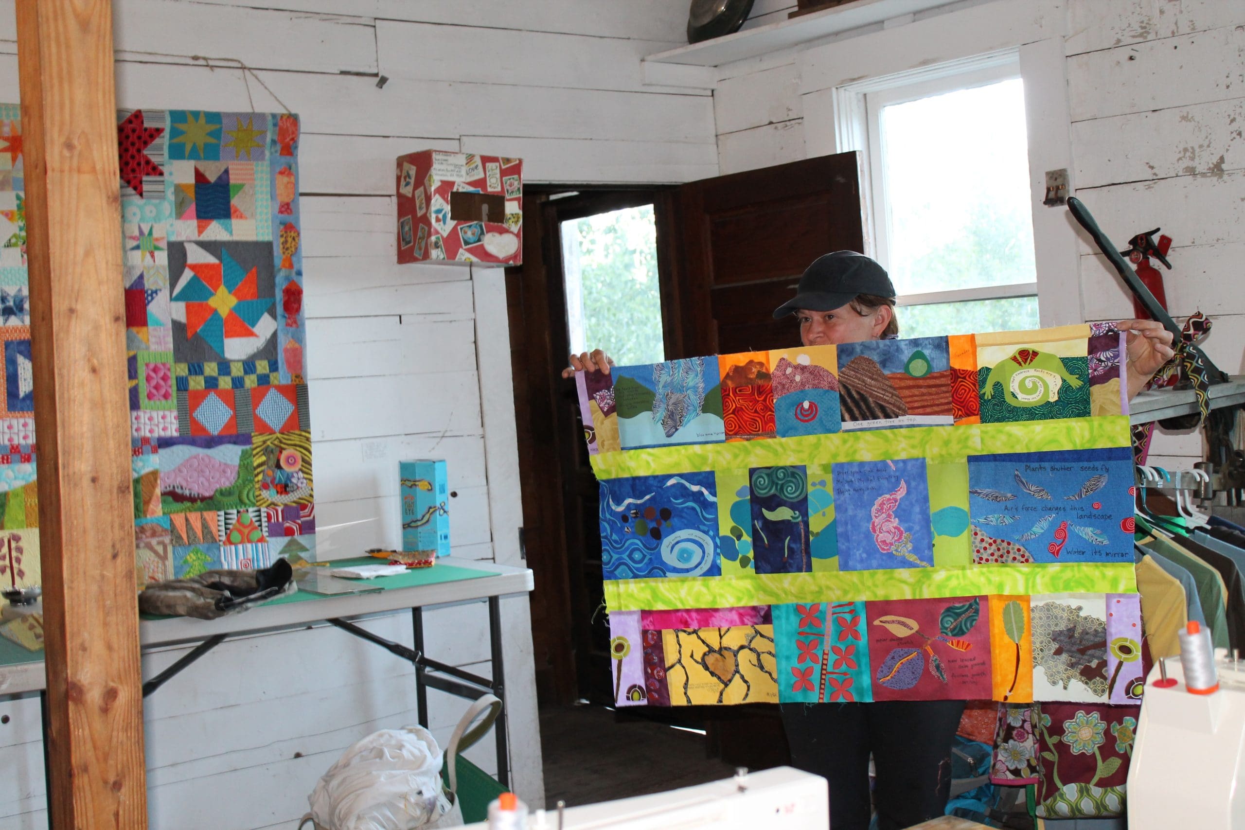 There were several interesting impromptu moments. A couple of years ago, I made a quilt called Dance Party at Tamara’s House. I named the quilt after a super fun evening dancing in Tamara’s unfinished cabin. Her friends pooled their money and bought the quilt for Tamara. It traveled in several shows until I finally brought it out to McCarthy for Tamara to hang in her newly finished cabin.