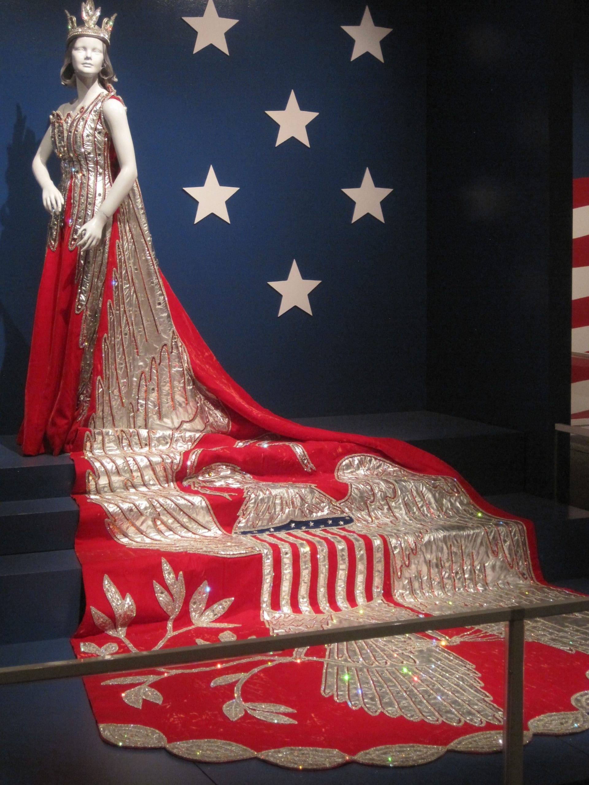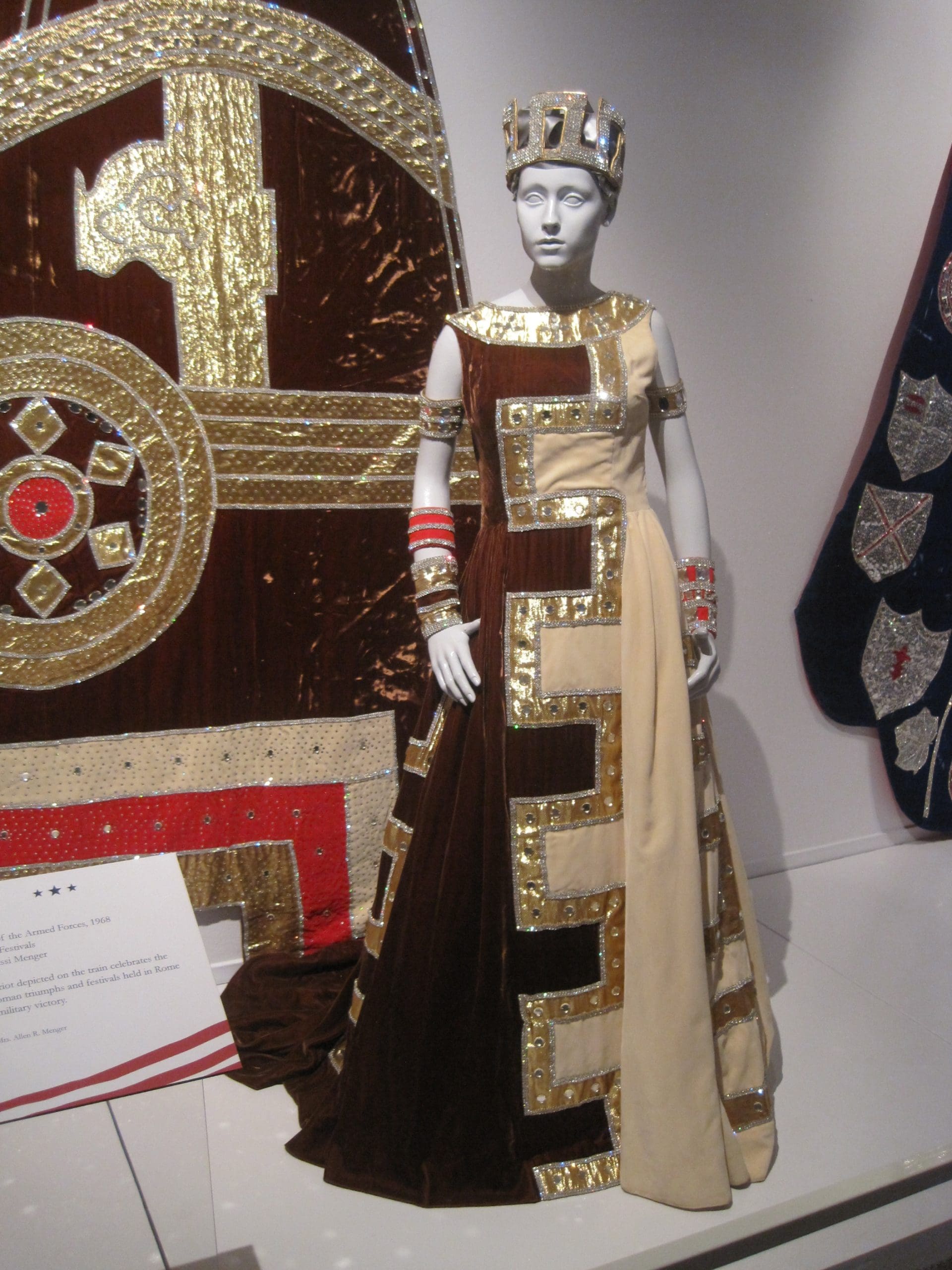 Prior to the conference, I had read an interesting article in the Surface Design Journal about these gowns and was very much looking forward to seeing them in person. The article looked at all aspects of the dresses–the glitter, the tradition, the politics. This year’s Witte exhibition of the gowns featured dresses from their collection that celebrated a patriotic or military court theme.