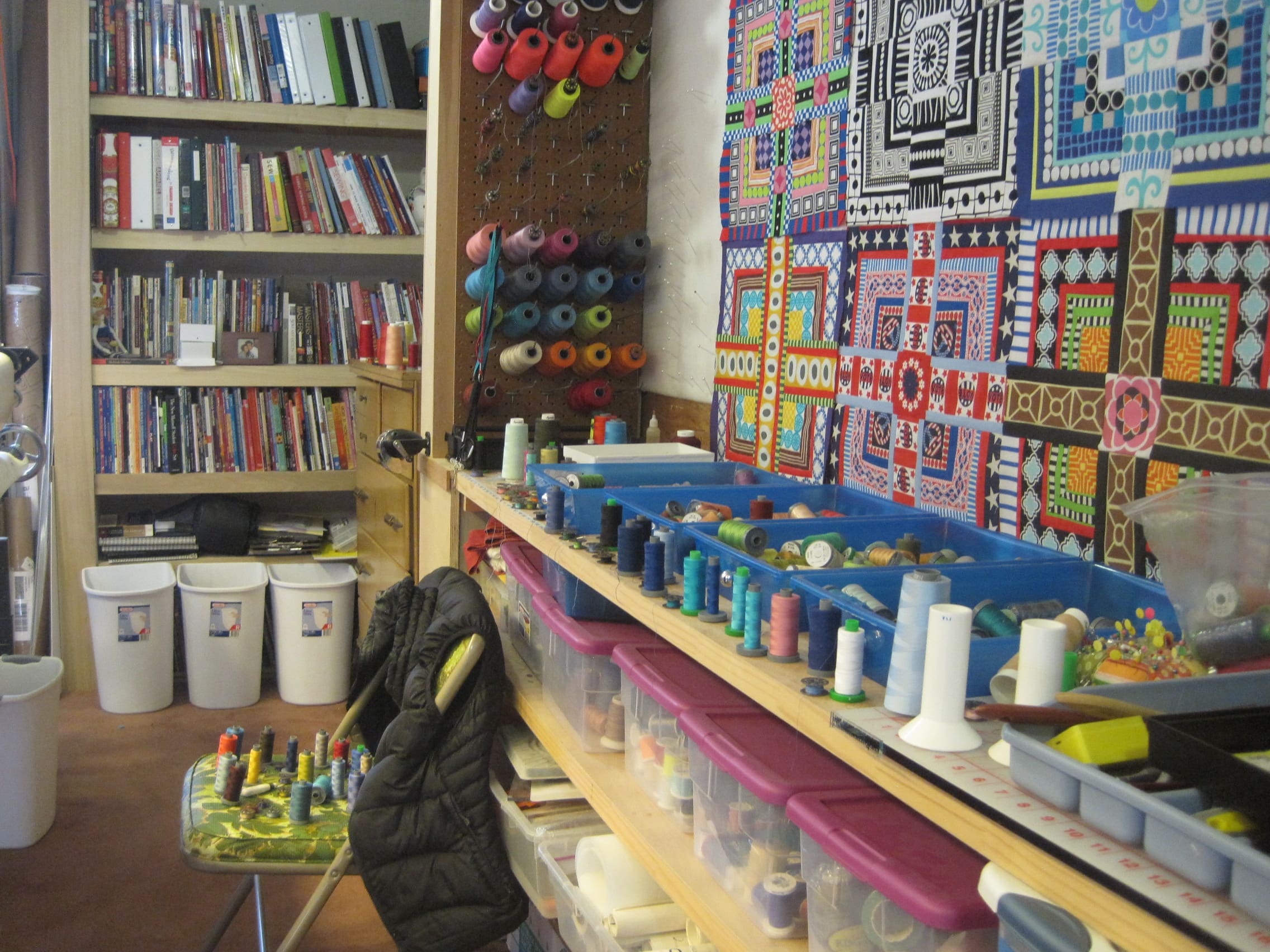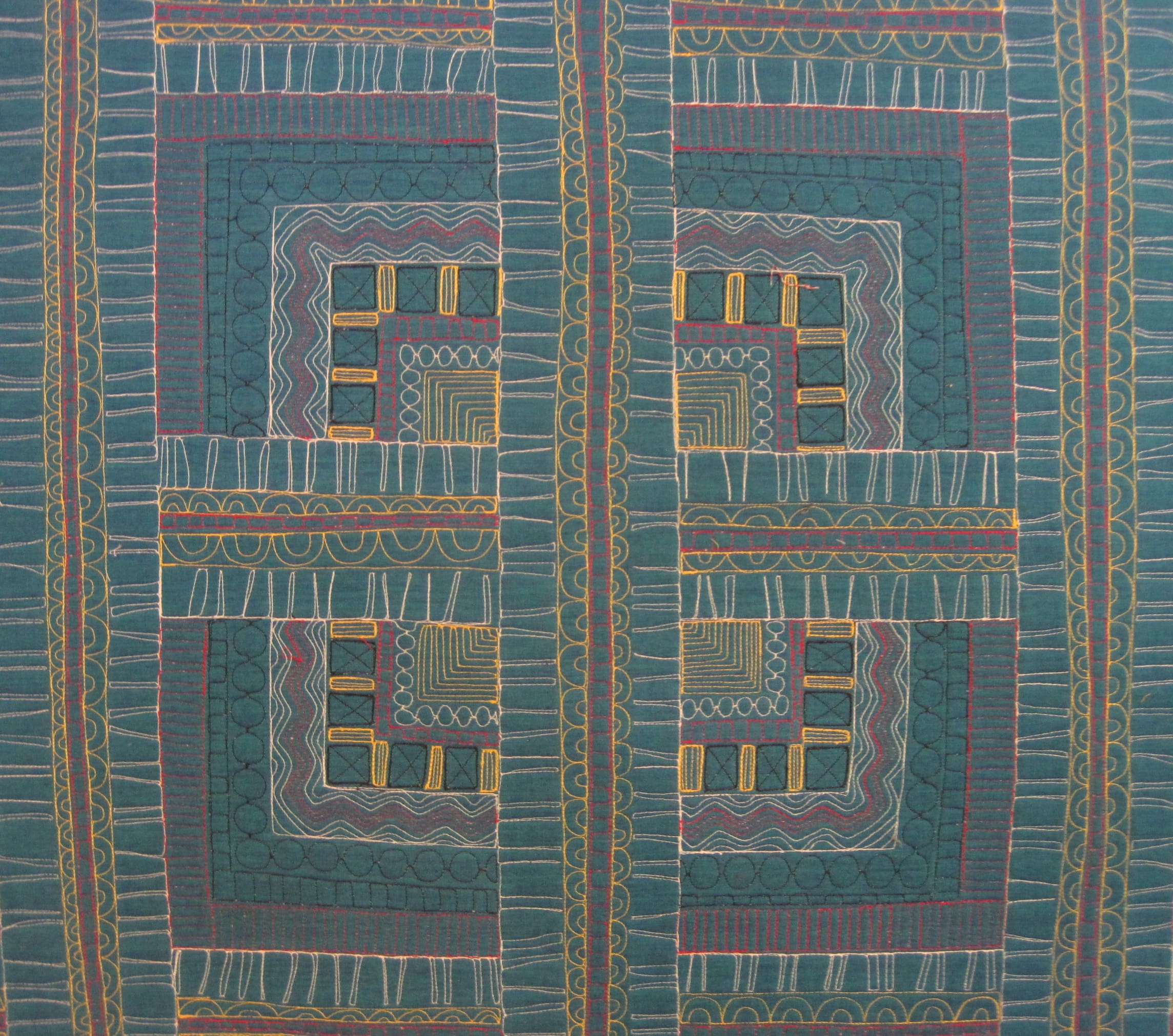 The next step in a prolonged bout of procrasination is always quilting. I decided to try and give each color its own quilted motif. That’s a lot of different colors of thread. In the end, several fabrics shared motifs.