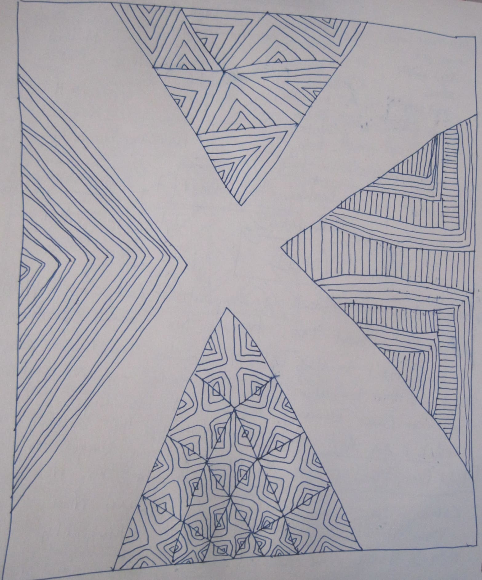 I began to understand that I was going to be making “prints” out of solids to fill the X portion of the piece. So I start stitching. Here is a sketch of what some of my print ideas are for the piece.