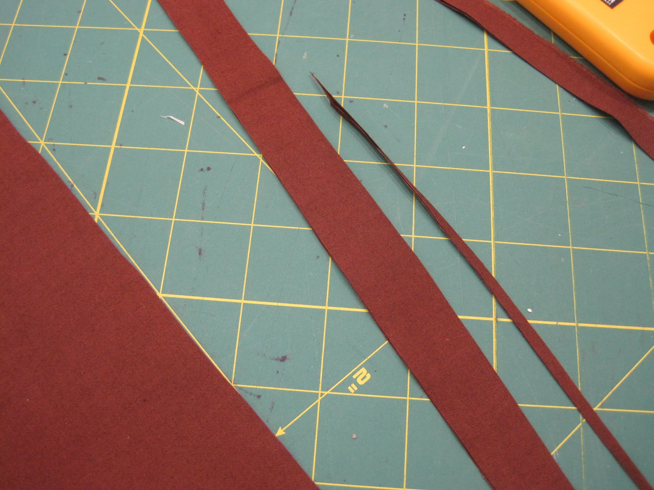 I take my ironed fabric to my cutting mat and using one of the diagonal lines on my mat, I line my fabric up. I smooth out the edge by cutting a nice clean line without using my ruler.