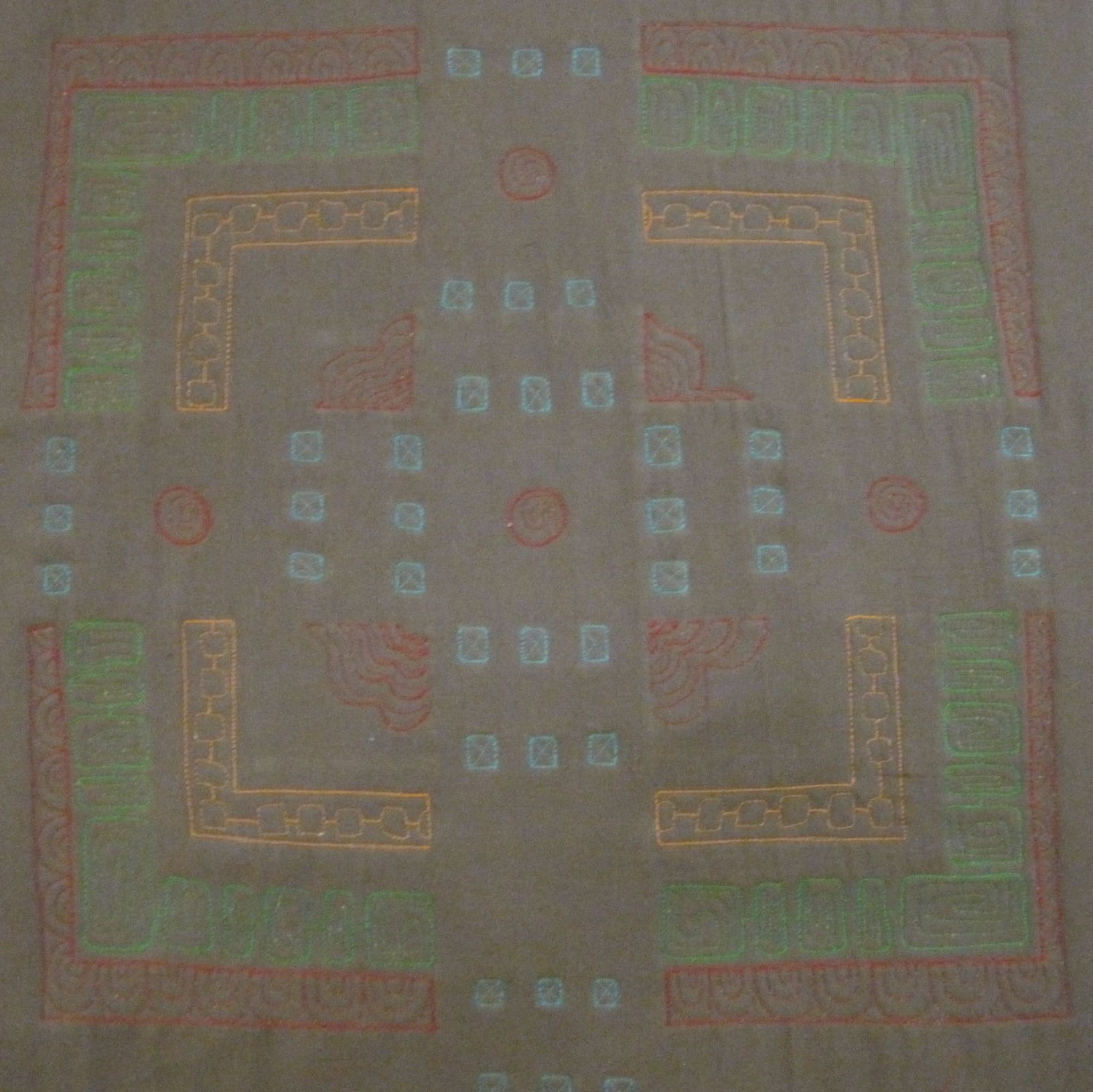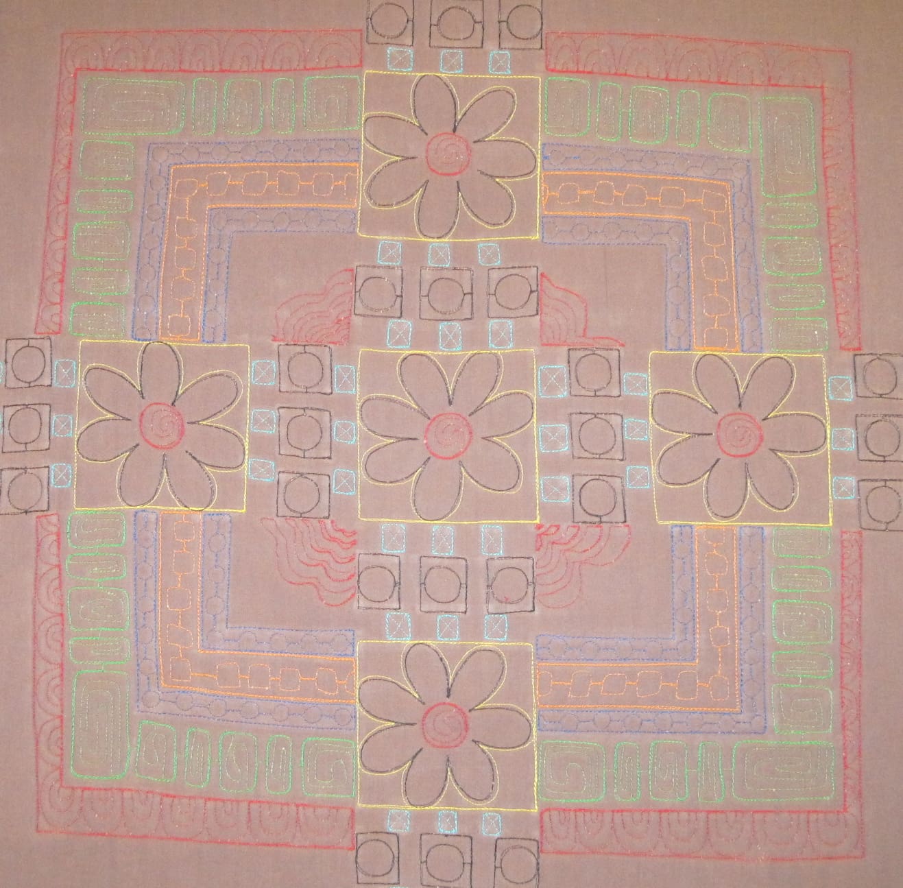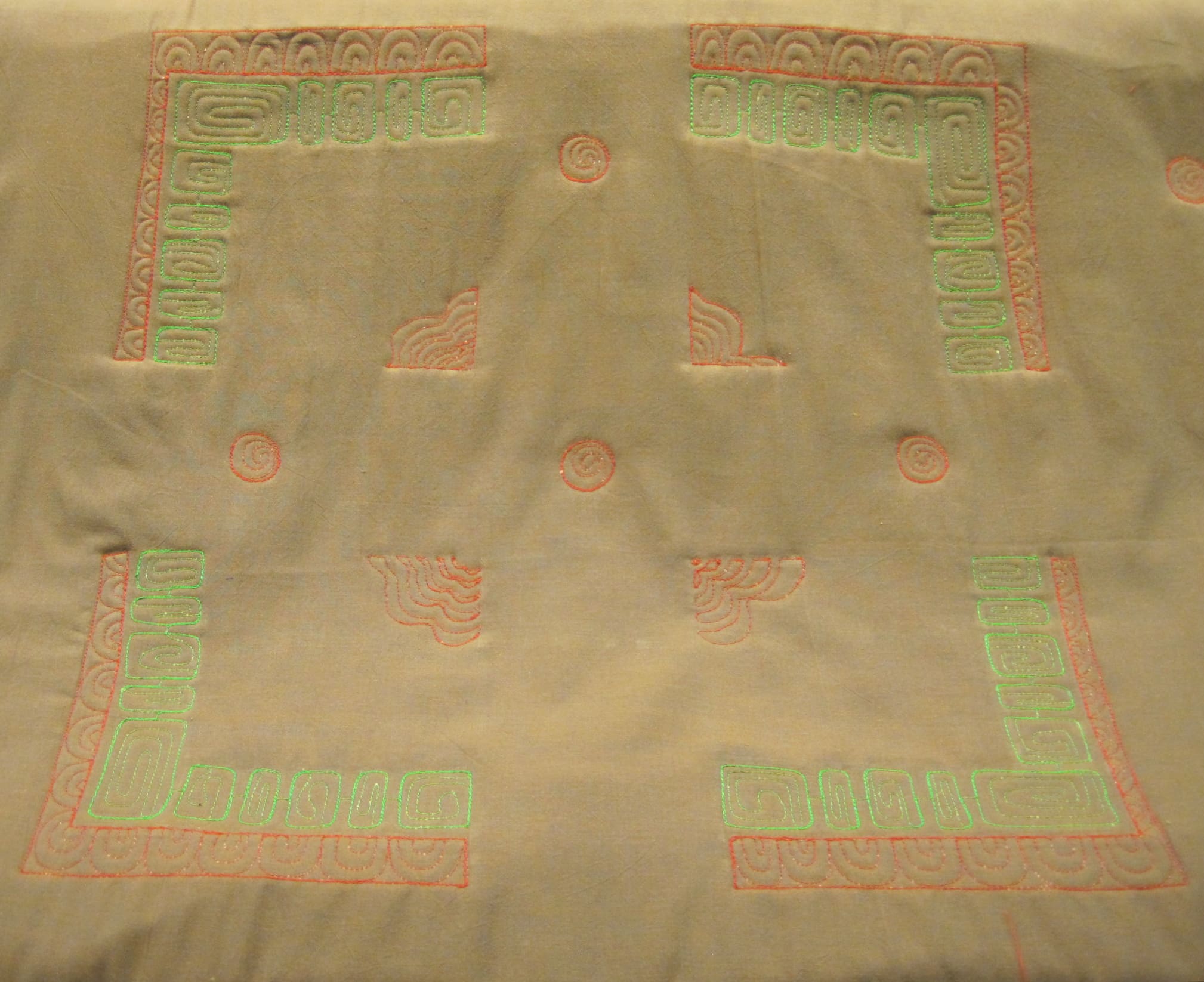 At this point, I decided to stop being lazy and actually pull the quilt off of the long arm and pin it onto a design wall for photographing. This is the entire quilt with green, red, and turquoise stitching. Some of you may notice that I started to stitch in white but changed my mind.