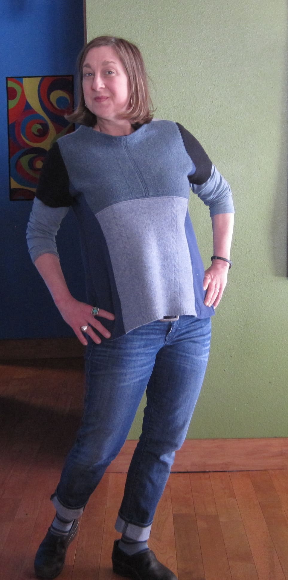 I created a collar out of a sweater edge. Using the edges of old sweaters as the edges of the new garment tends to work really well. The finished edge is sturdy, and you don’t have to hem it.