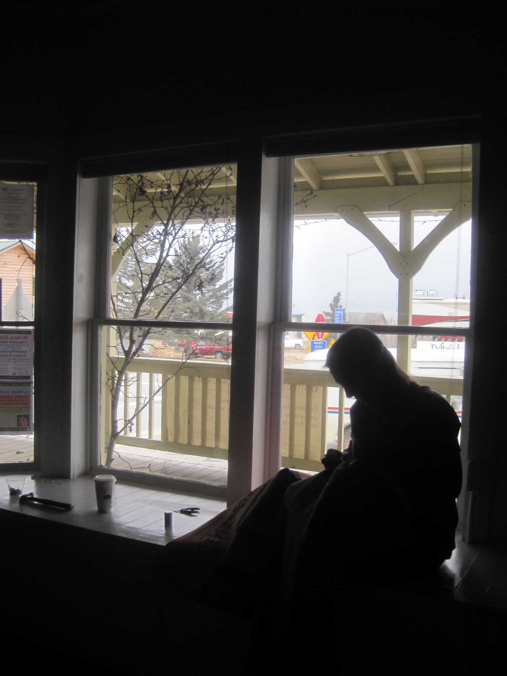 Snow Storm Homer, Alaska 2014While most of the town remained without electrical power, we had a little fully charged hen party. It was quite delightful. We talked about art, and craft, and movies, and food, and community. Once Asia and Maura finished cooking, they began painting, and all the while I stitched.