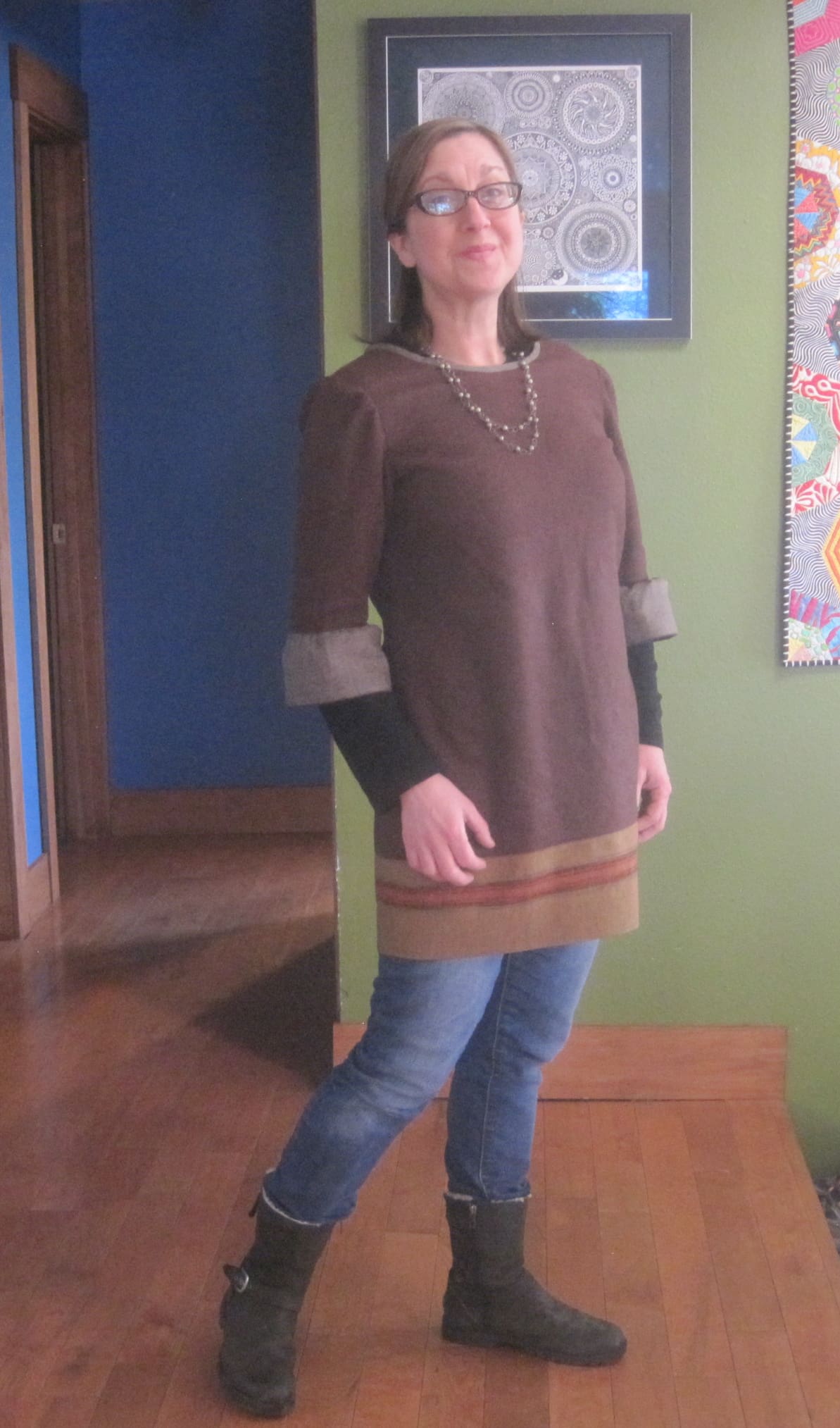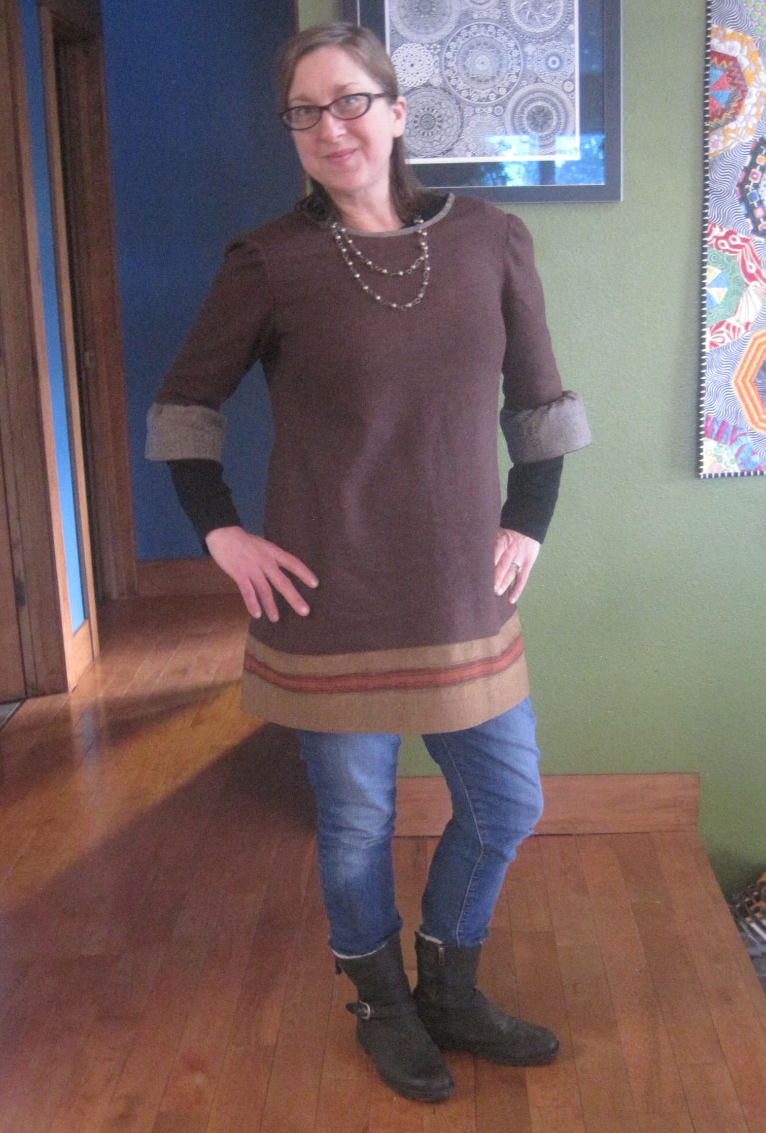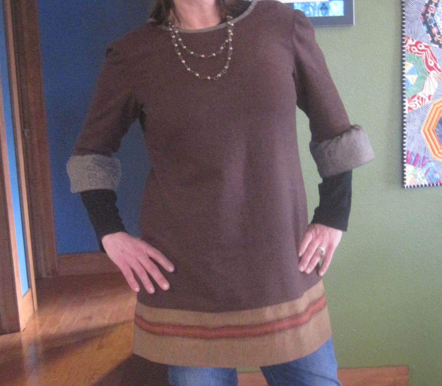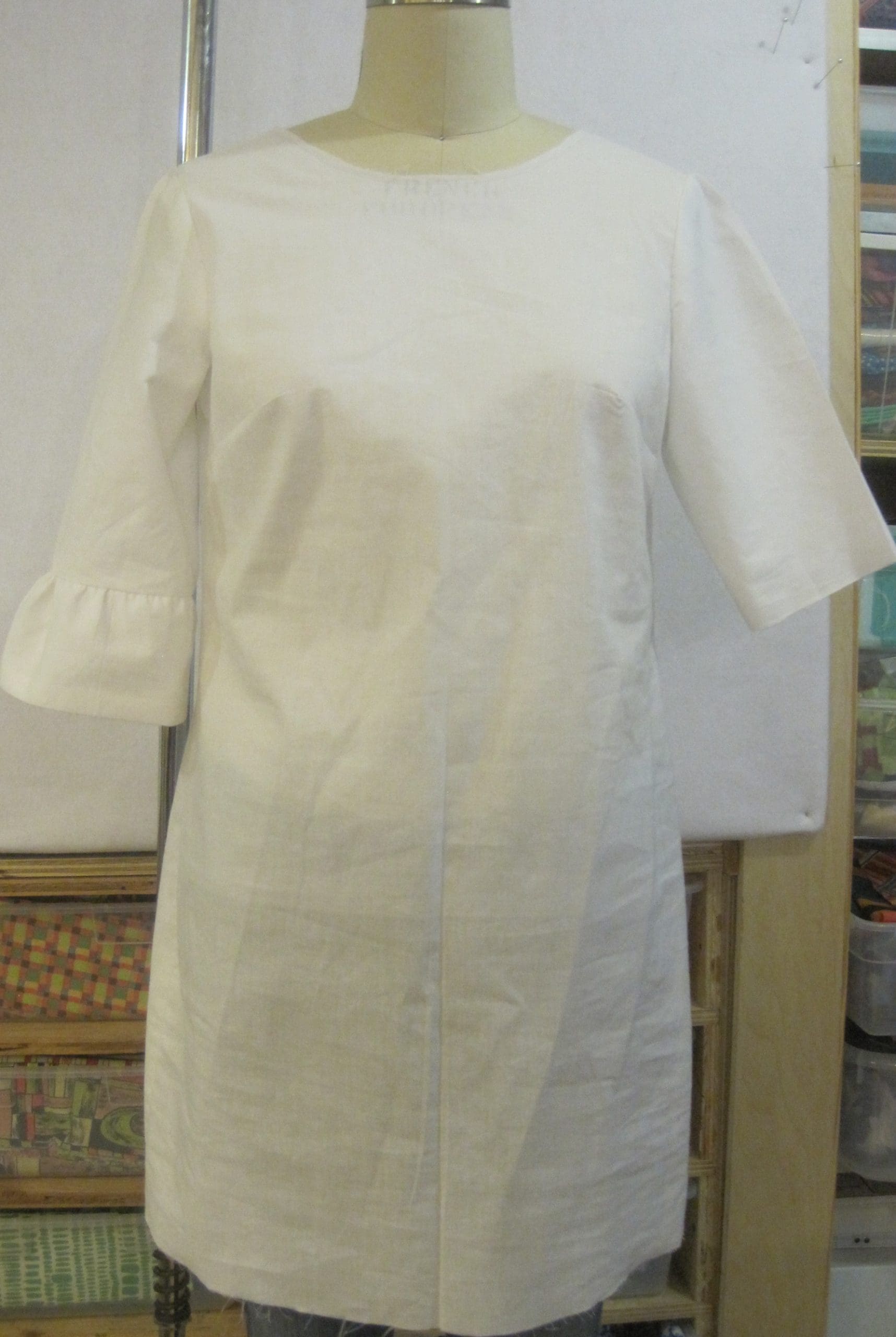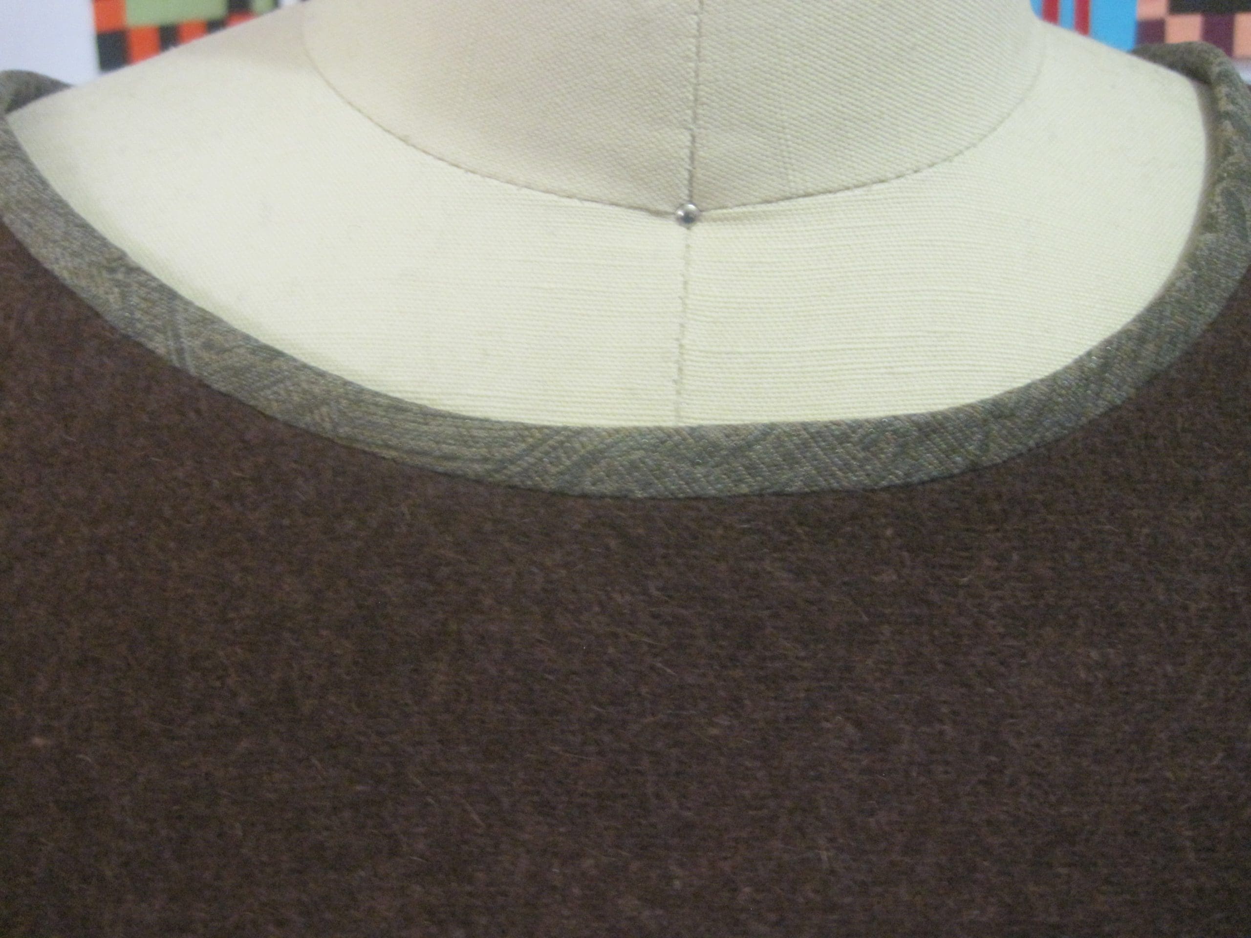 I discovered that I am one size on top and another on the bottom. I went back to my traced pattern and corrected this–blending the two sizes. I also significantly shortened the garment. The pattern finishes at 33 3/4 inches, while my finished garment is 29 1/2 inches.