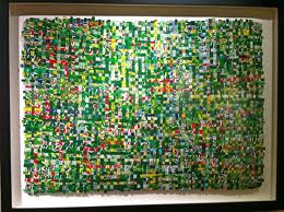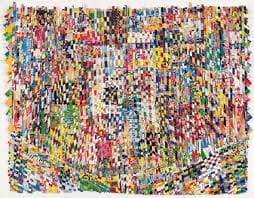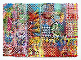 Cincinnati, Ohio artist Jonpaul Smith takes found paper–often related to consumer products like cereal boxes and candy wrappers–and weaves them into wacky tapestry-like work. He does this work by using very little glue. I am so curious to see this work in person.