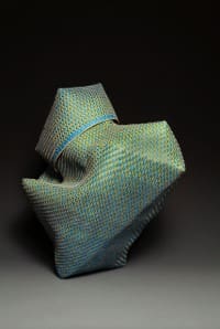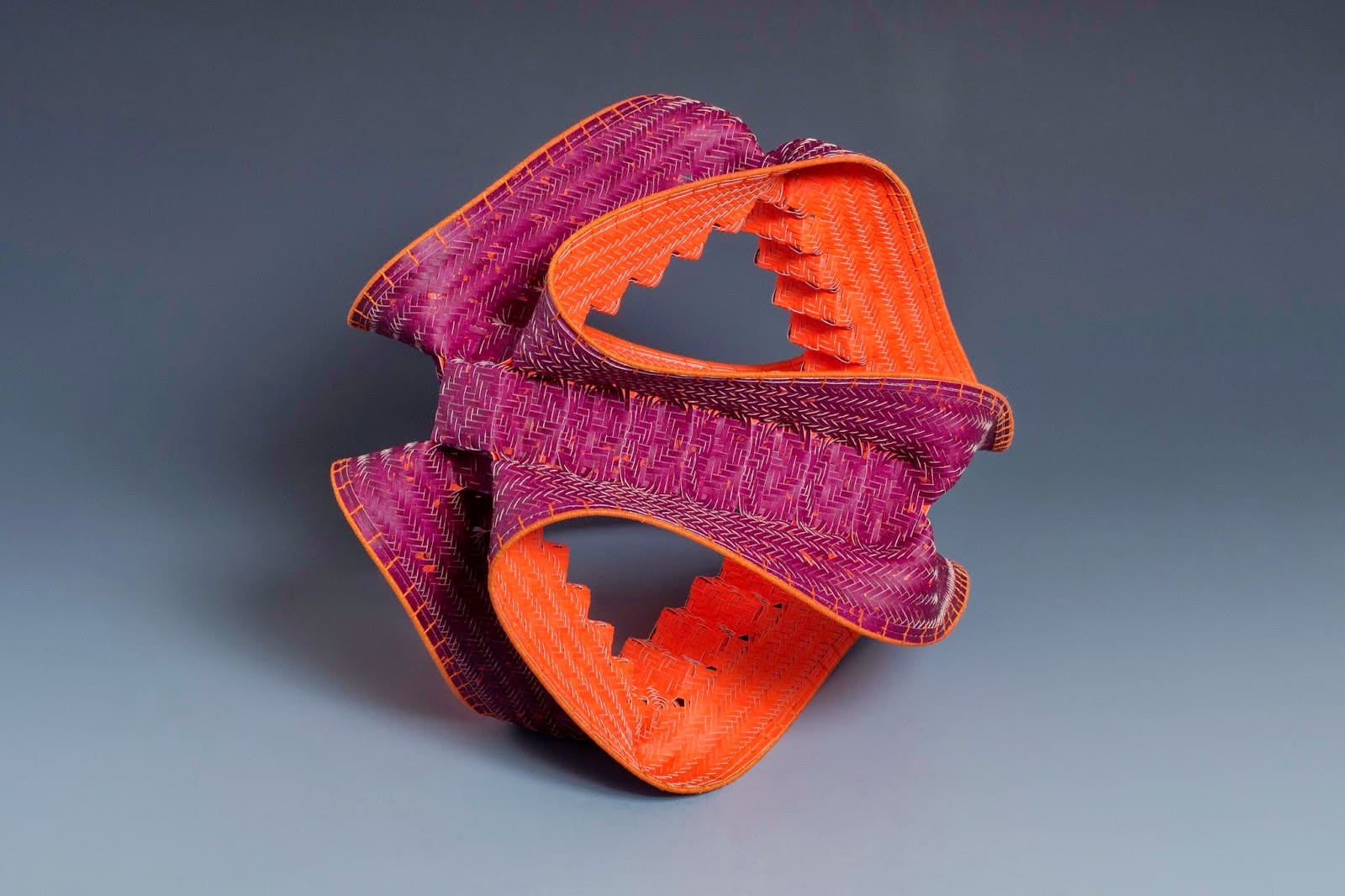 Artist Dorothy McGuiness, a contemporary basketmaker, who takes painted water color papers and weaves them into new dimensions. McGuiness lives in Everett, Washington. We previously exhibited together at the Bellevue Arts Museum’s BAM Biennail 2012 High Fiber Diet. I wrote about that exhibit here. Aren’t these pieces just wild?
