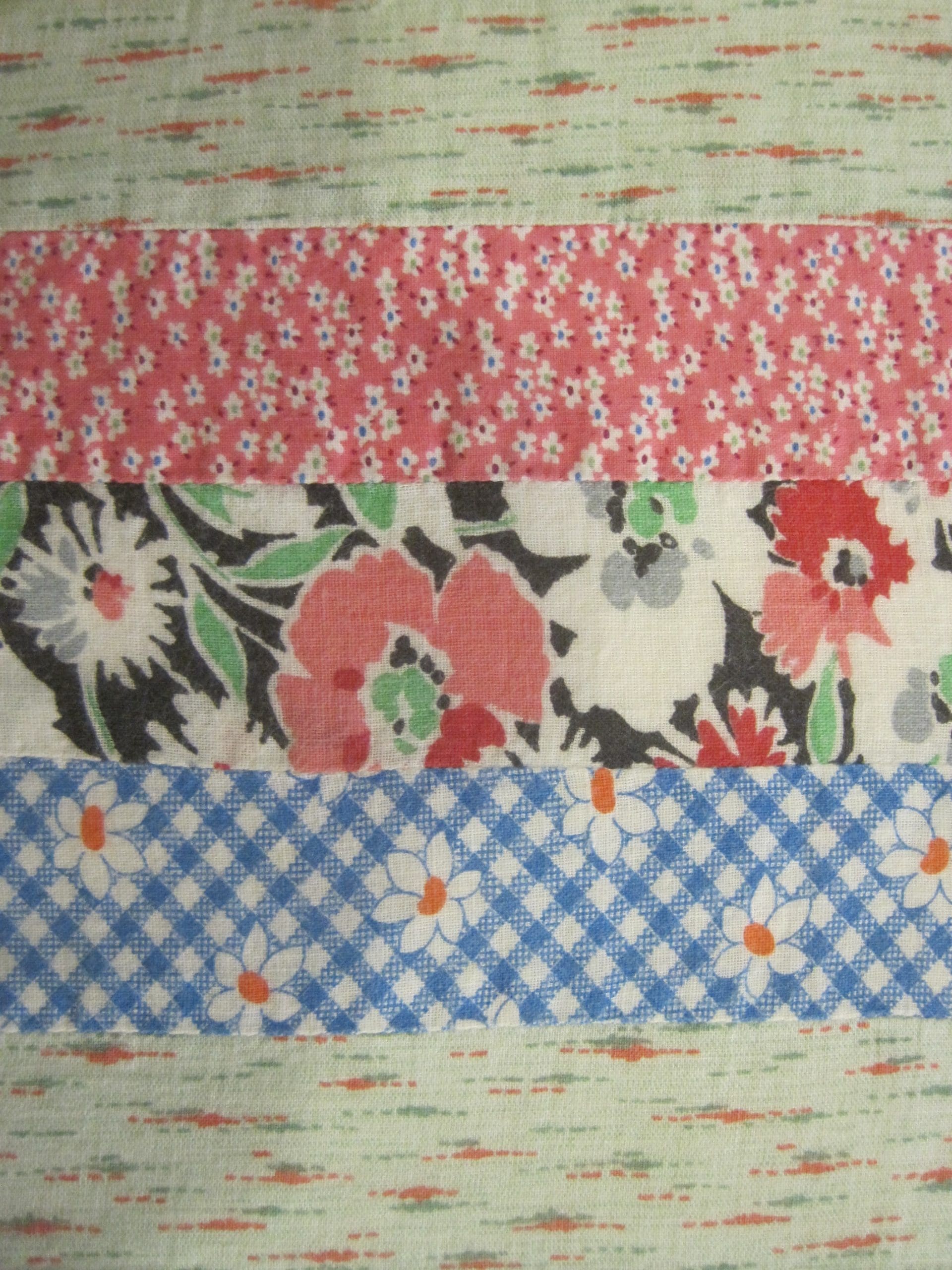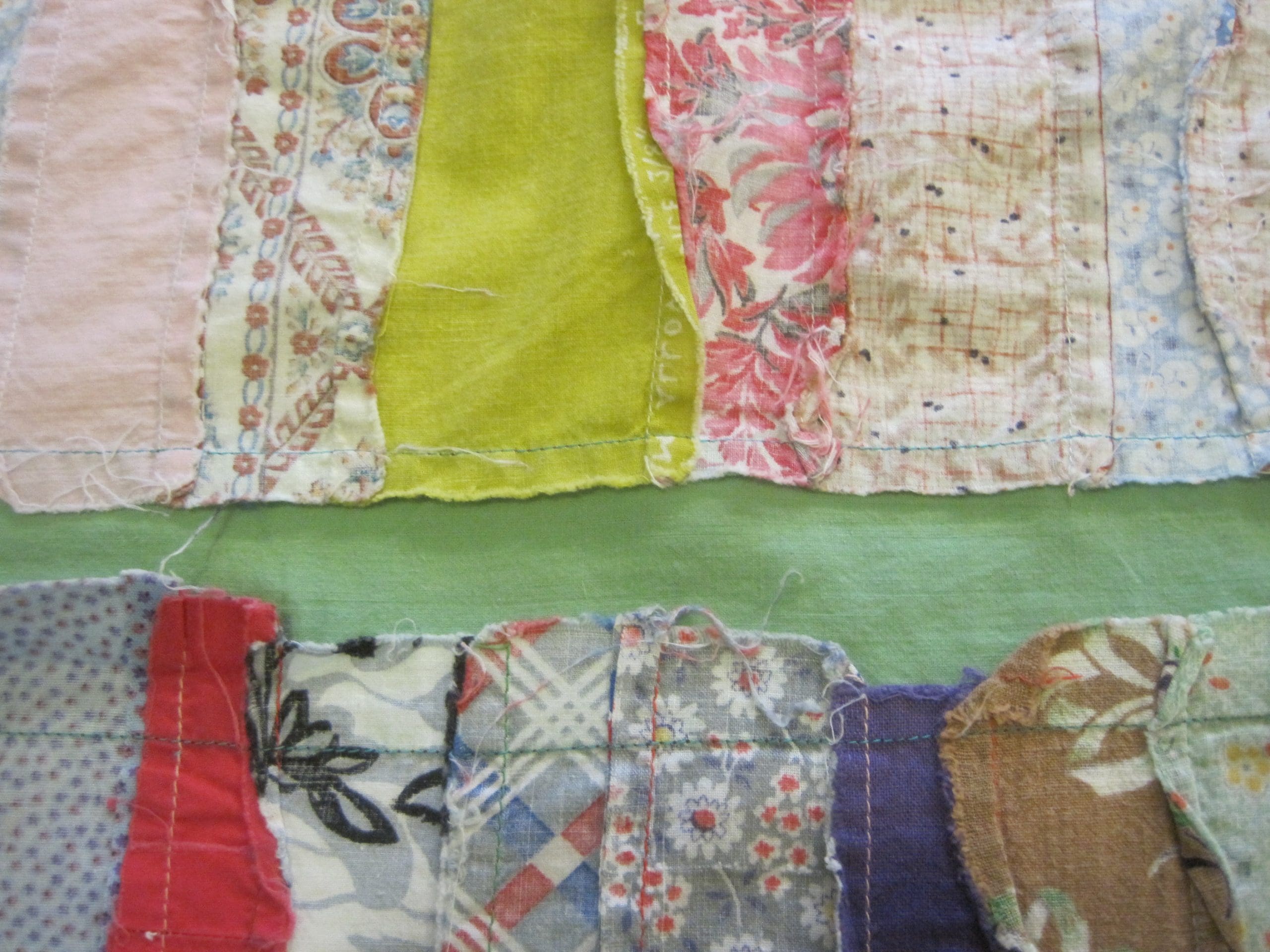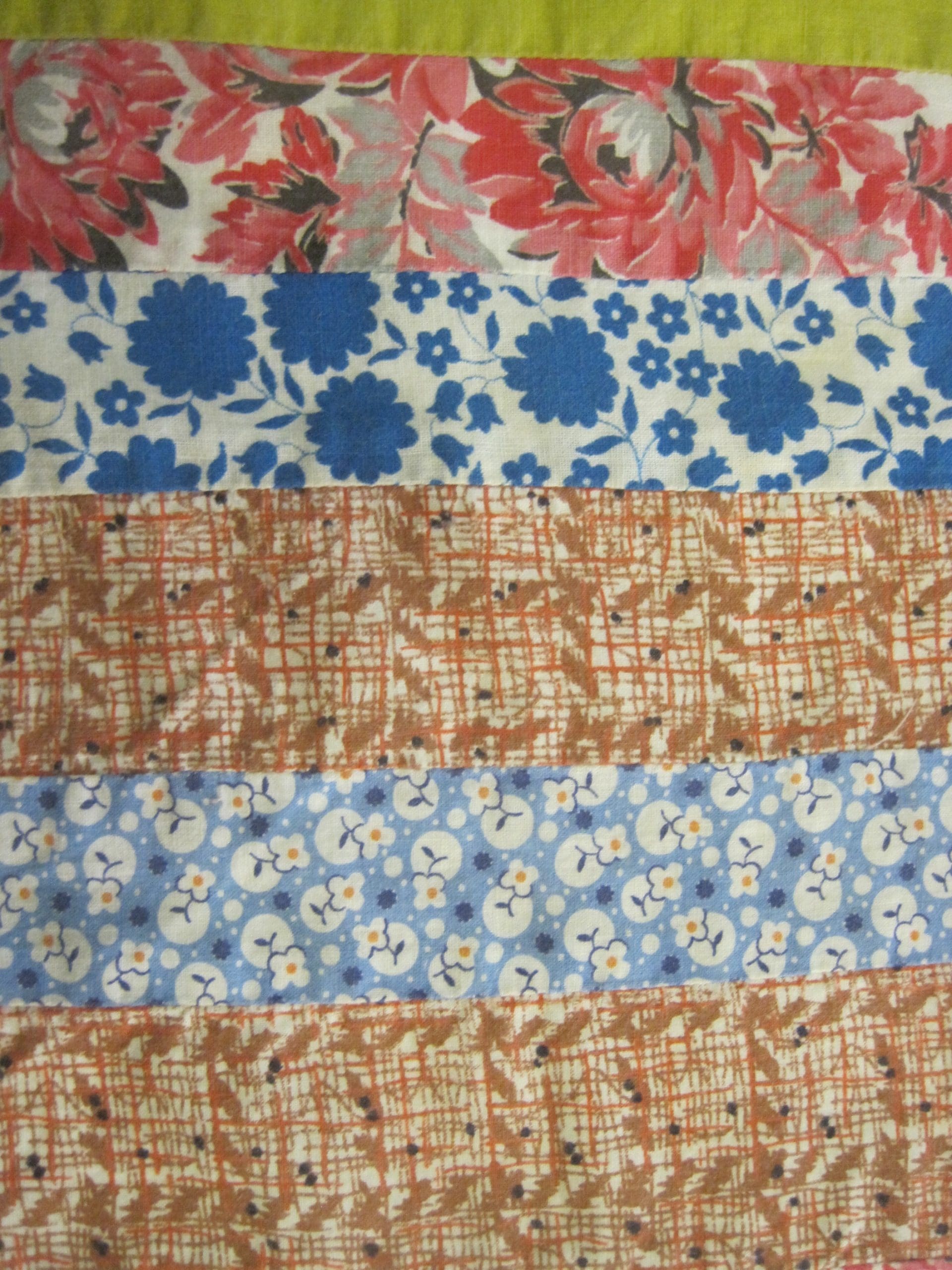 Still, I had no idea what to do with the vertical green spacers that divided the pieced prints.