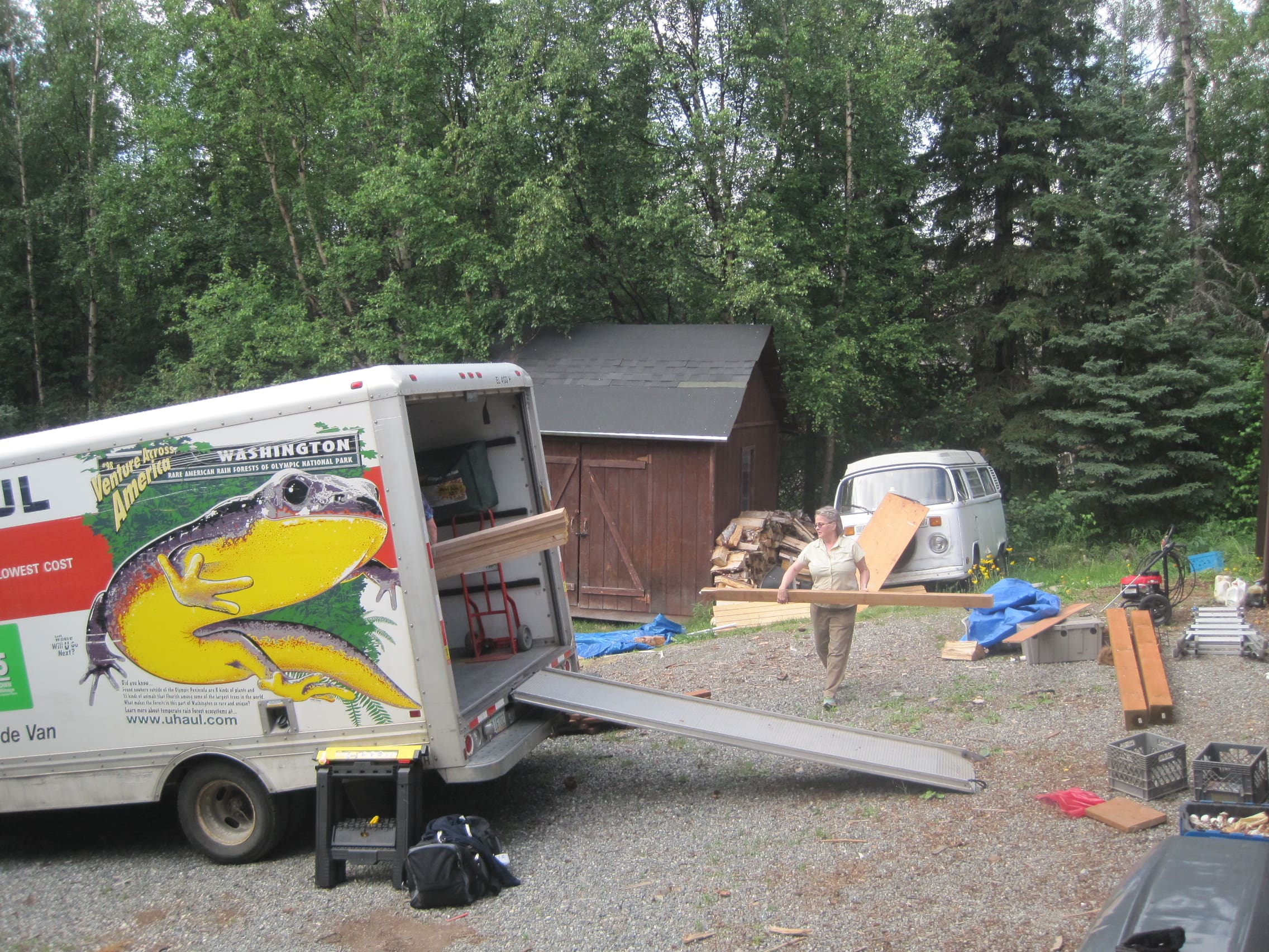 She is constantly working on it. In this photo, she is loading up wood for my McCarthy Studio. She rented a U-Haul and loaded it up with supplies for both of our cabins. We say the Jones are easy, it’s the Garrett’s you’ve got worry about.