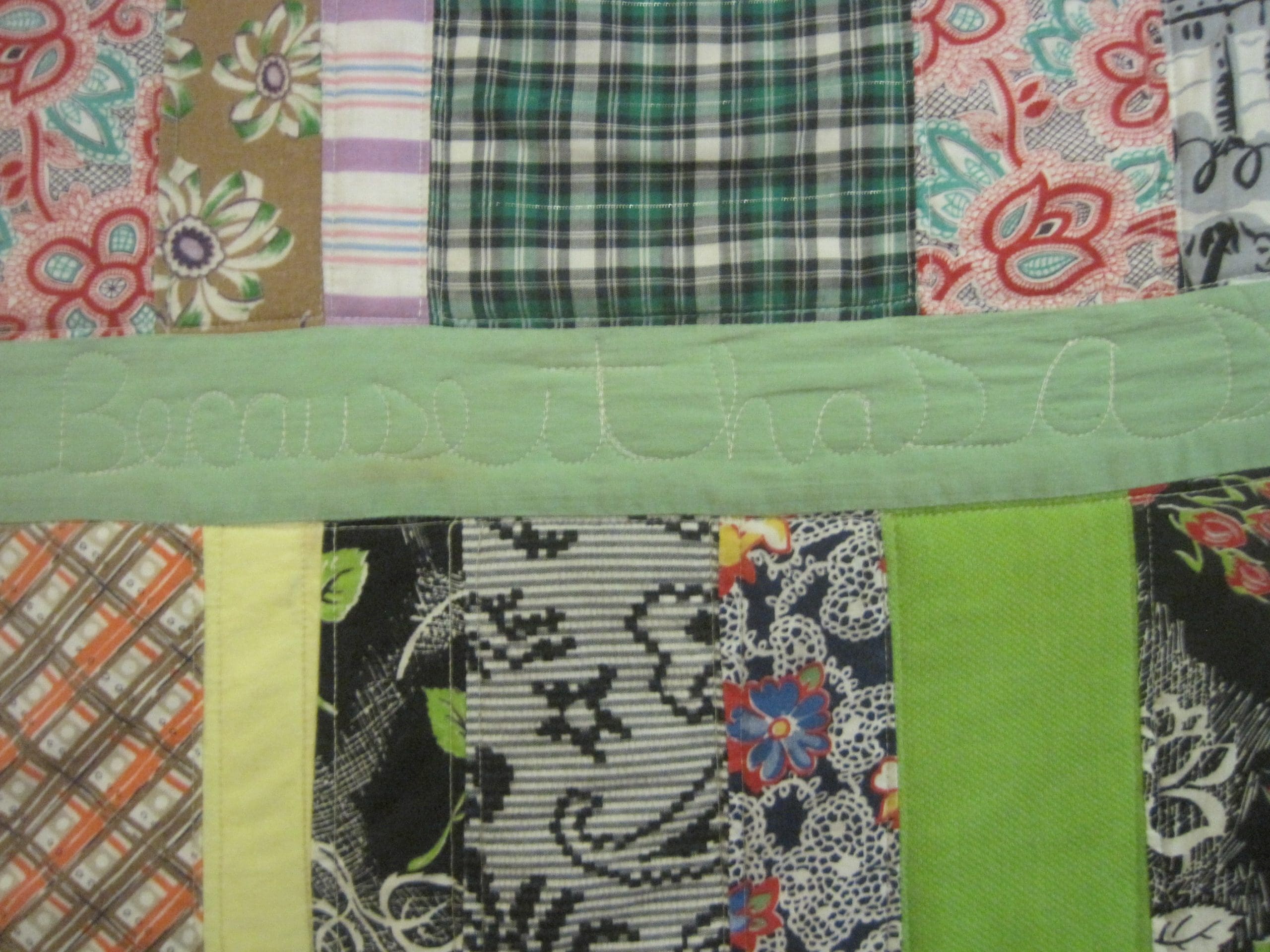 I wanted something simple but personal. Because Patt and I met at Wrangell Mountains Center writing workshop, it seemed appropriate that I write on the quilts. I’ve been wanting to do this for a long time, just write with my long arm.