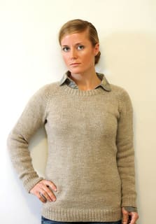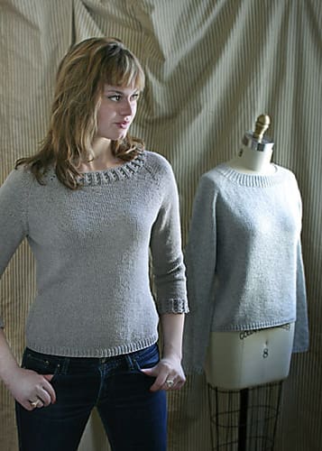 I think the Ladies Classic Raglan is your best bet. Don’t be spooked by the model. She is pissed off because 1.) she didn’t knit it in black (DUH…blondes should not wear “oatmeal”), 2.) she didn’t have the perfect yarn, and 3.) she spent way too much time obsessing about the perfect sweater and now it is July and she’s damned hot for this photo shoot. Plus she’s starving, models are always starving. Somebody give that girl a hamburger.
