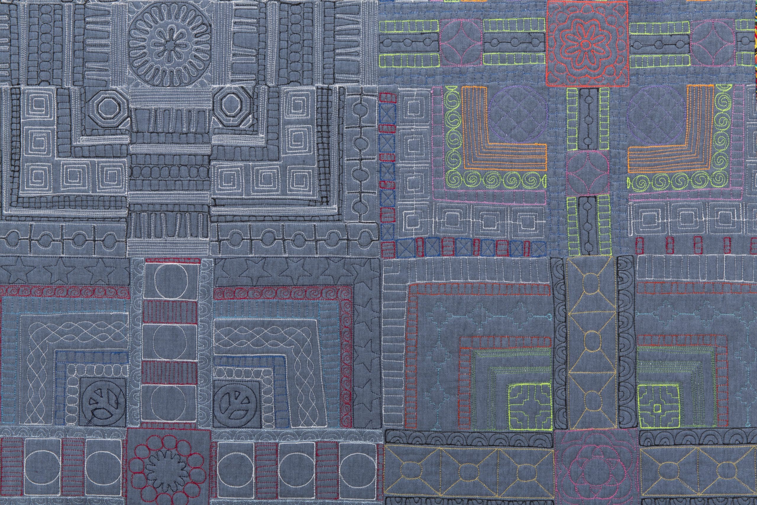Congratulations on the 250th Post… I came across your blog when you were at McColl Center for the Arts. I am intrigued by your style, and impressed by your “Community” work. Would enjoy hearing more about that process and all that goes with it. Am just learning to FMQ on my domestic machine so would greatly appreciate any tips and tricks you can pass along. Love your use of color and pattern!