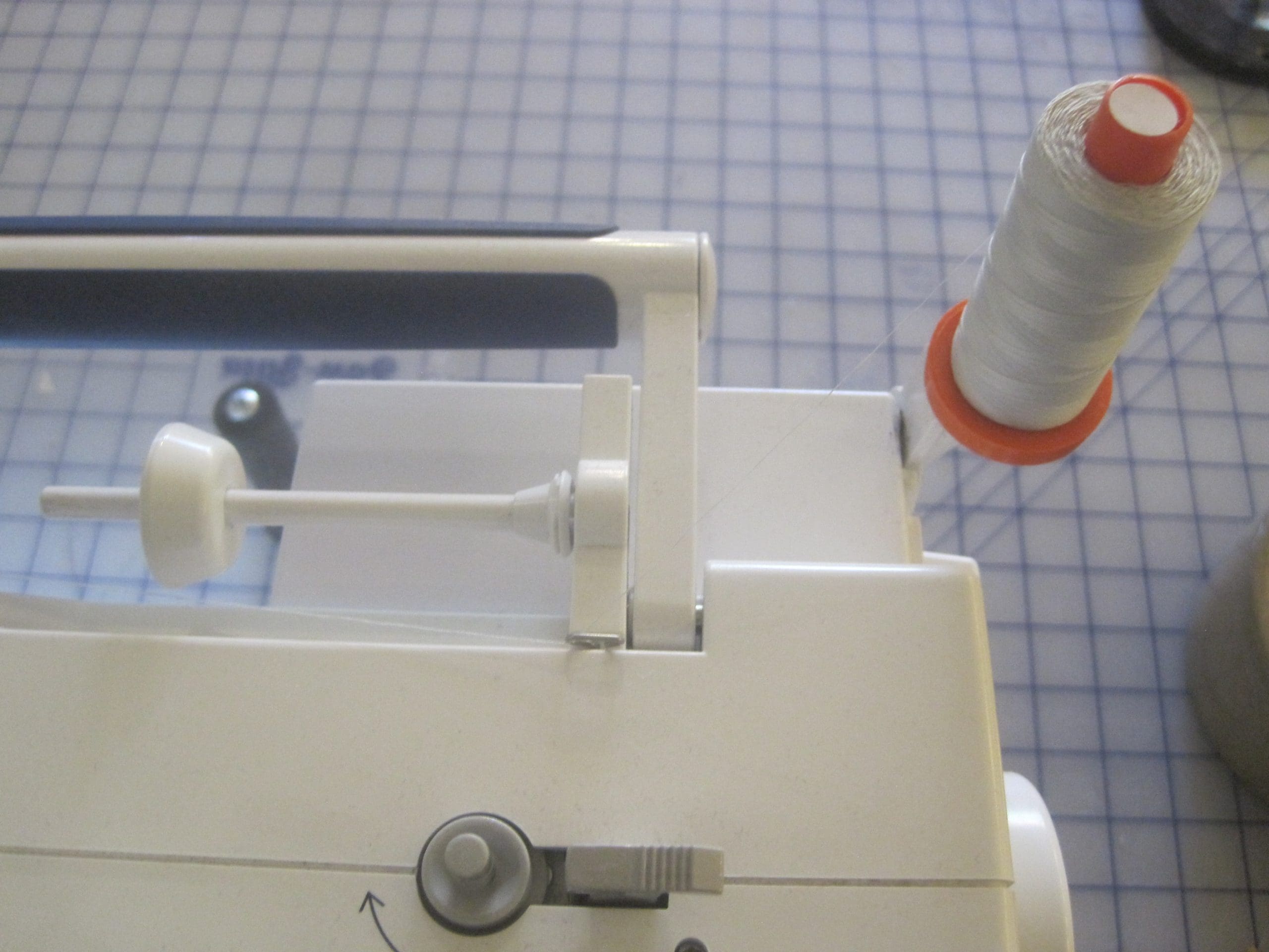 Ideally, your machine will you both the option of a horizontal thread holder and a vertical thread holder. As you can see my machine has both. But if you can only get one, get a machine with a horizontal thread holder. I, and my students, have found that a horizontal thread holder usually means a more consistent tension and stitch especially if you are machine quilting. (It is not as important for piecing, but if your piecing you are probably also quilting, right?)