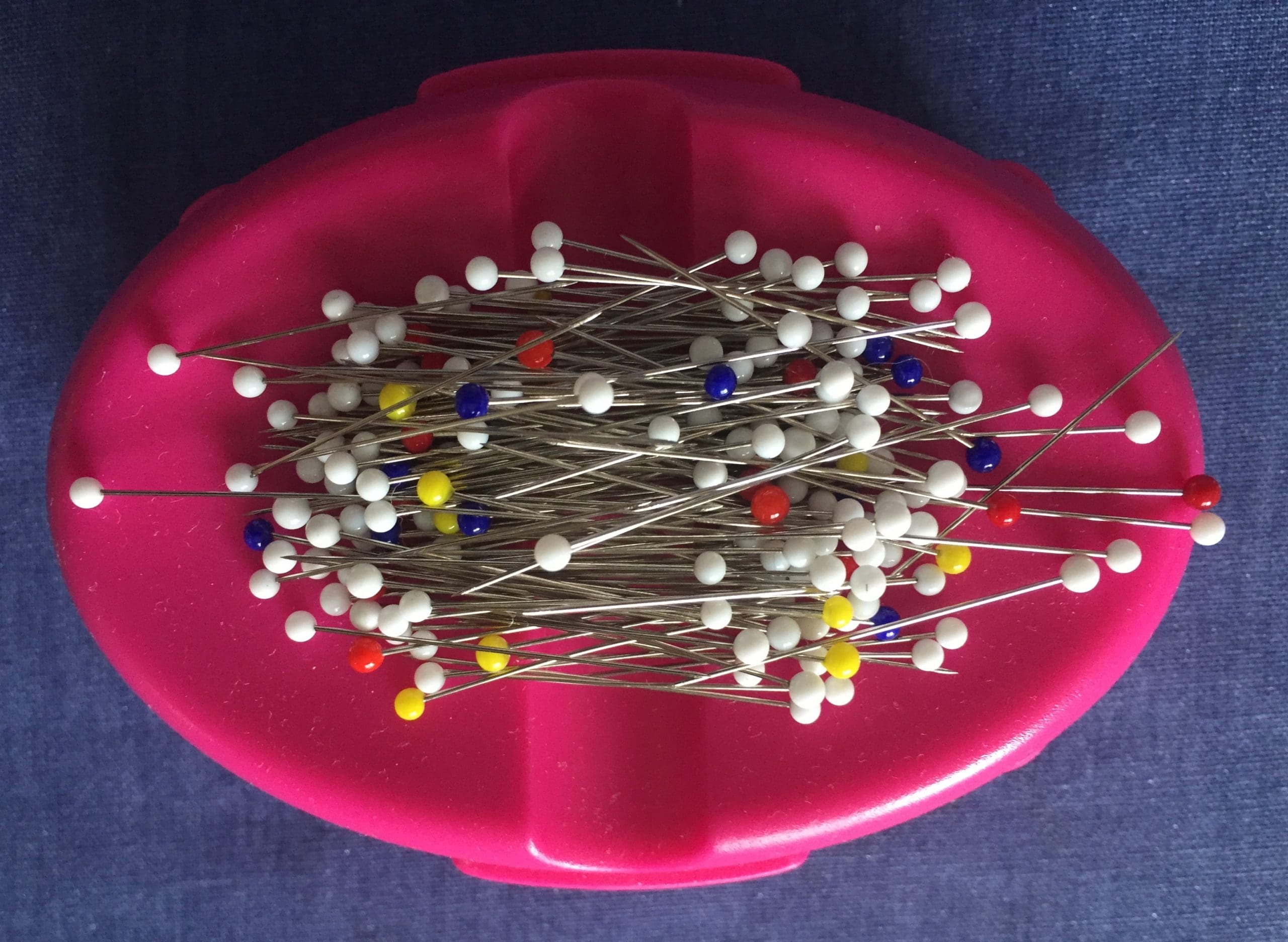 Straight pins and magnetic pin cushion–I do like these clover pins with blue, white, red, and yellow heads because they are stable enough to use frequently with an assortment of textiles.