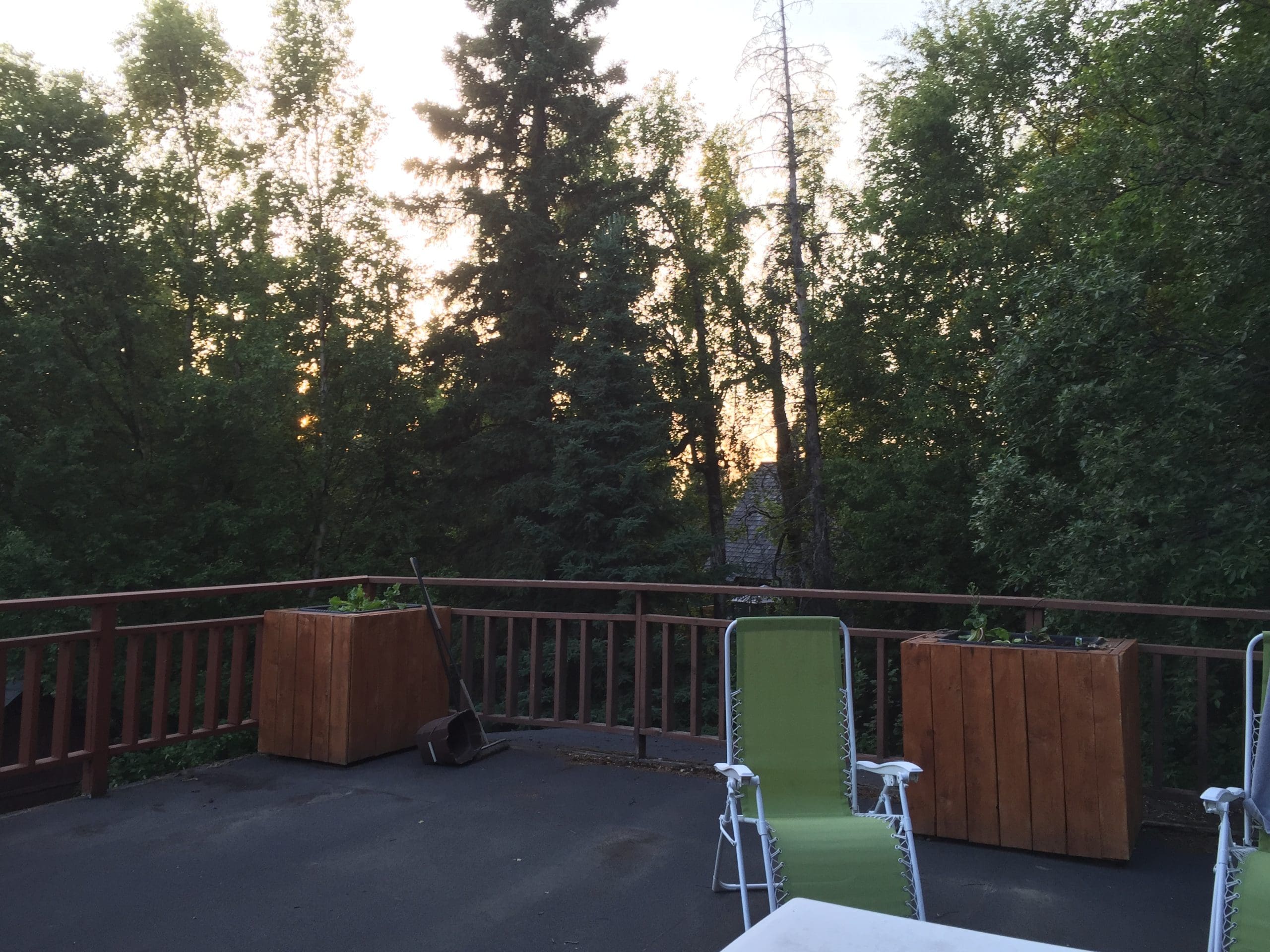 I think it was last week that I shared my thoughts on the perfect sewing machine for piecing. Things get a little confusing this time of year–Night is day, and well, there is no night. Here is our deck around one in the morning a couple of weeks ago.