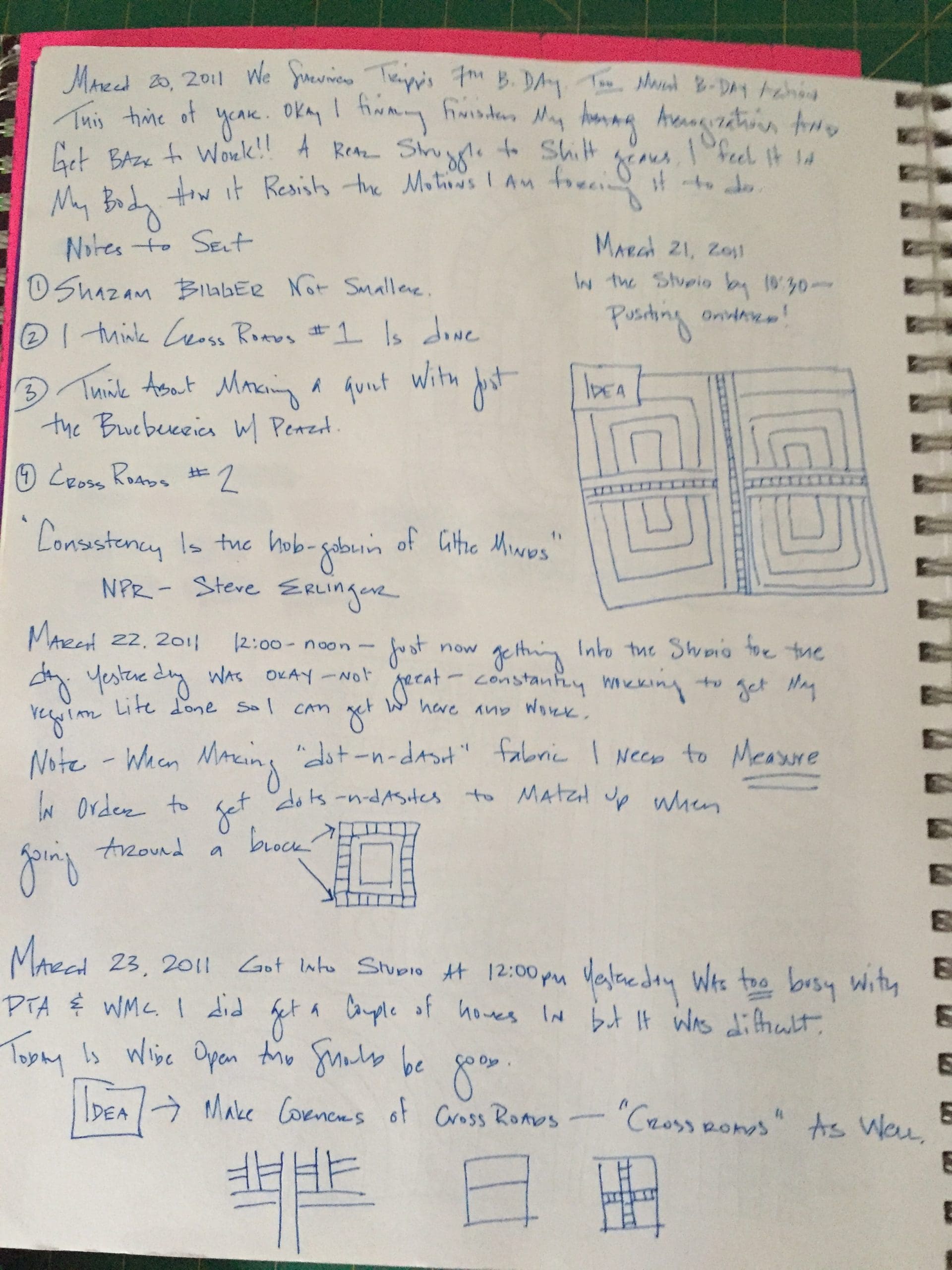 My journal has all kinds of things in it. I use it to document progress on deadlines, think through particular pieces, and as a store house for information.