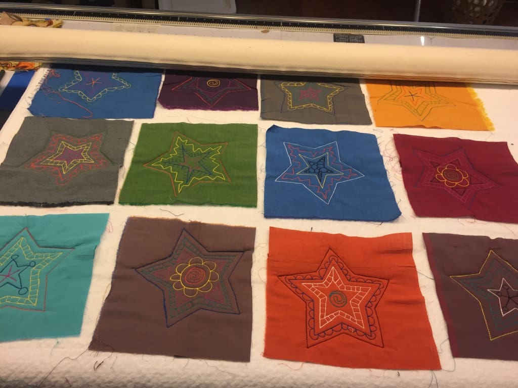 Here I have loaded a dozen on to my long arm, but you can EASILY do this on a domestic machine.