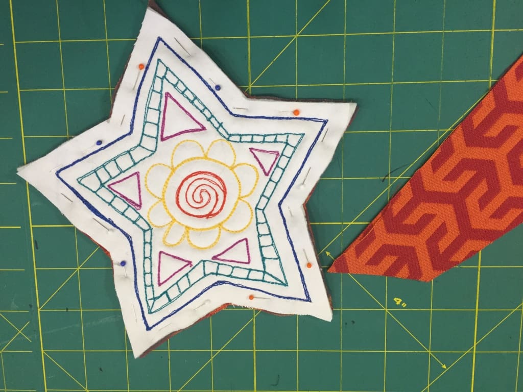 Pin around the star securing the backing fabric to the quilted star fabric. Using your scissors cut around the star.