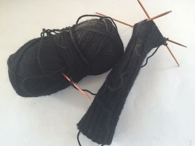 I am making my very first pair of socks. I know, boring black, but I am going to make teal knee-highs next. I have struggled getting used to the four double pointed needles. Several times, I have finished stitching and instead of moving the free needle, I move the needle with stitches. I just slide the needle right out and then I am left with 20 little gaping loops. Ouch. This week in class we will be turning the heel.