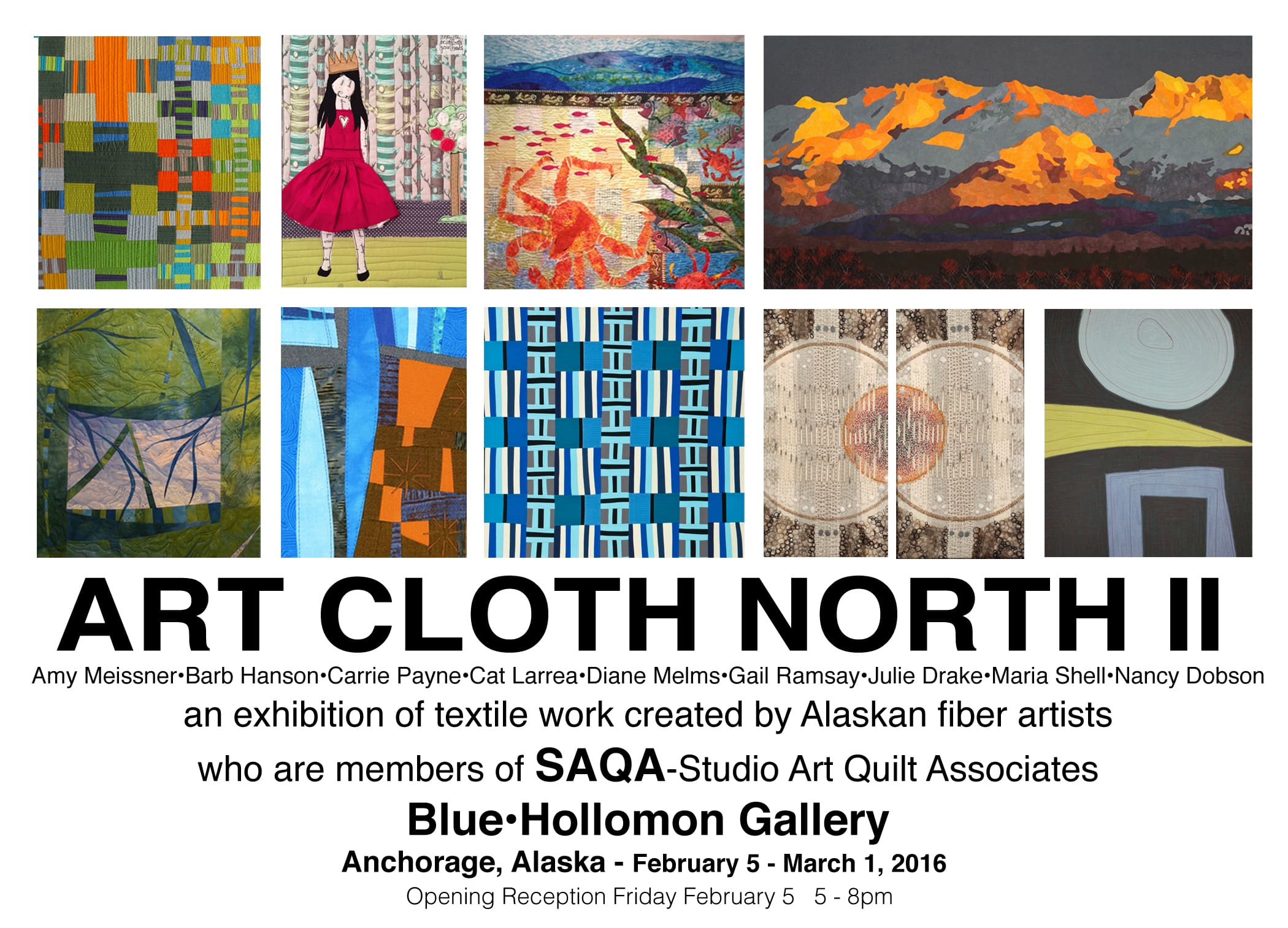 I hope you will join me this coming Friday, February 5th for the opening of the regional SAQA Show ART CLOTH NORTH II at the Blue-Hollomon Gallery here in Anchorage.