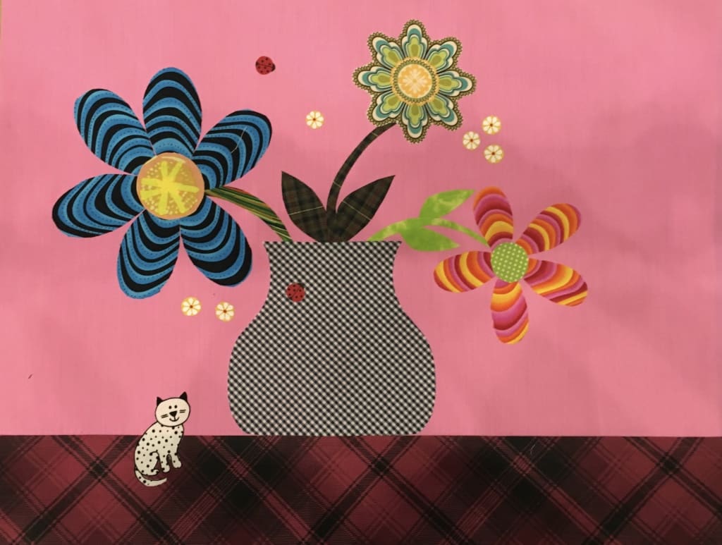 What a great adventure! The quilt with the big vase of flowers and the tiny cat tickles me.