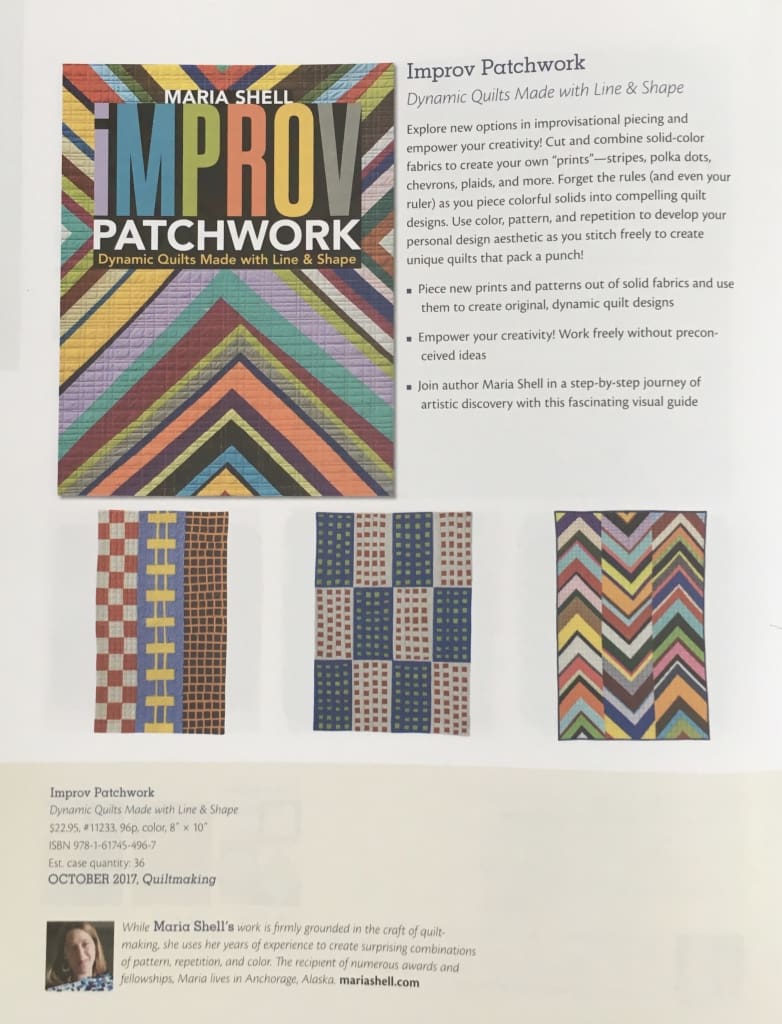 The reality of this book has been incremental. Last fall when I was getting up at four in the morning to stitch, the idea of a BOOK seemed so far away, so impossible. Improv Patchwork—Dynamic Quilts Made with Line & Shape is in the C&T catalogue listing upcoming publications. Just one more sign that I am almost an author.