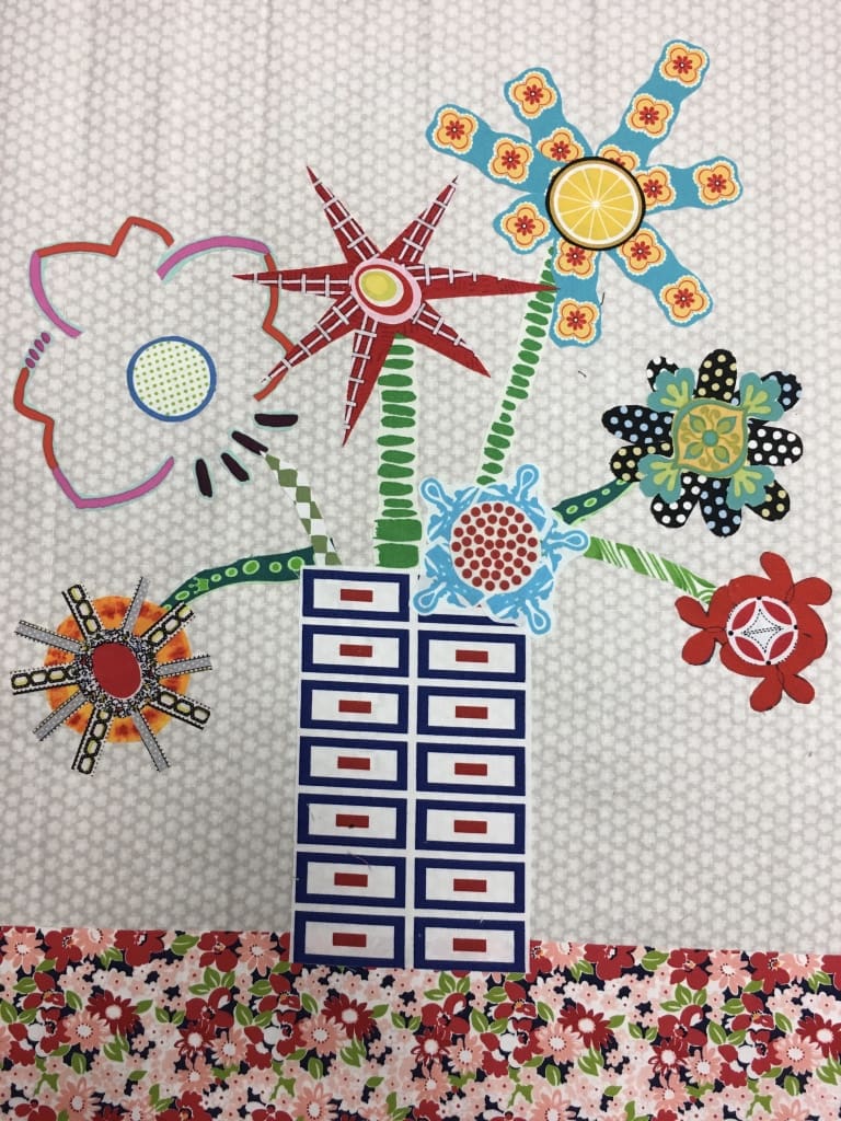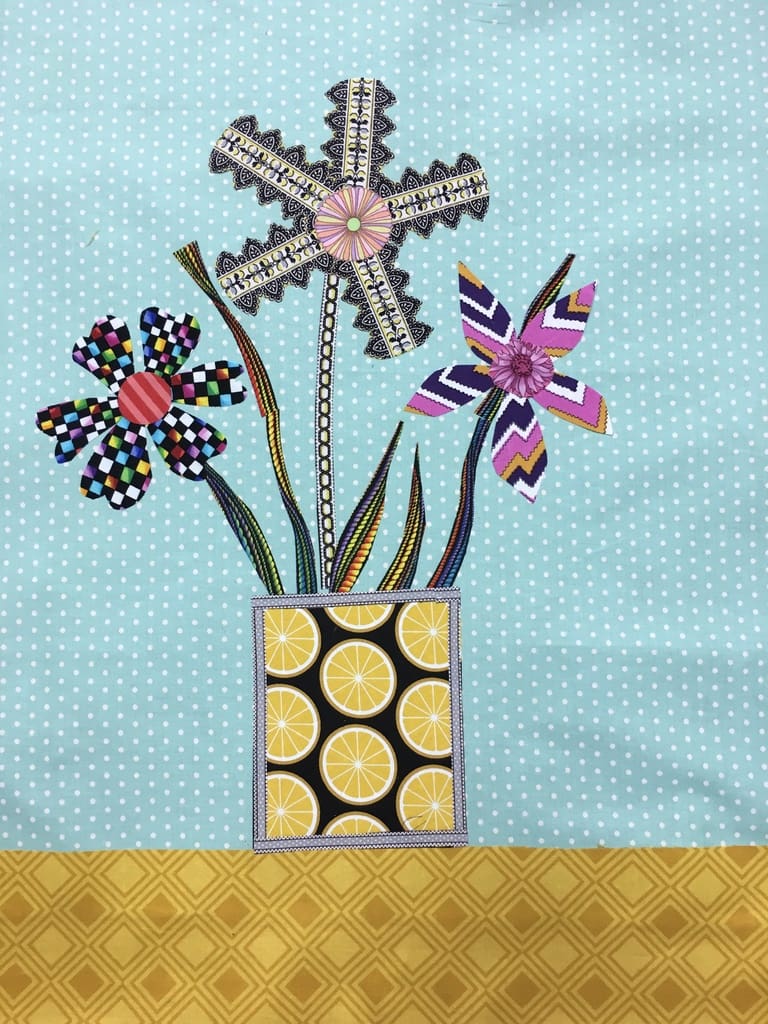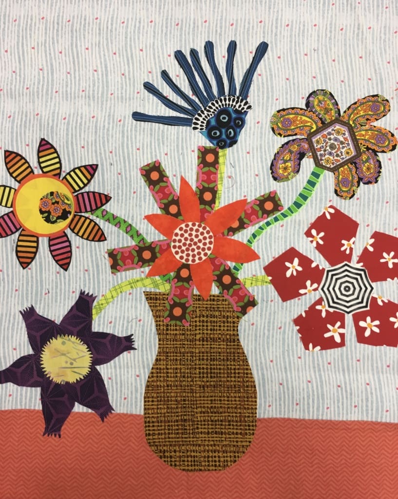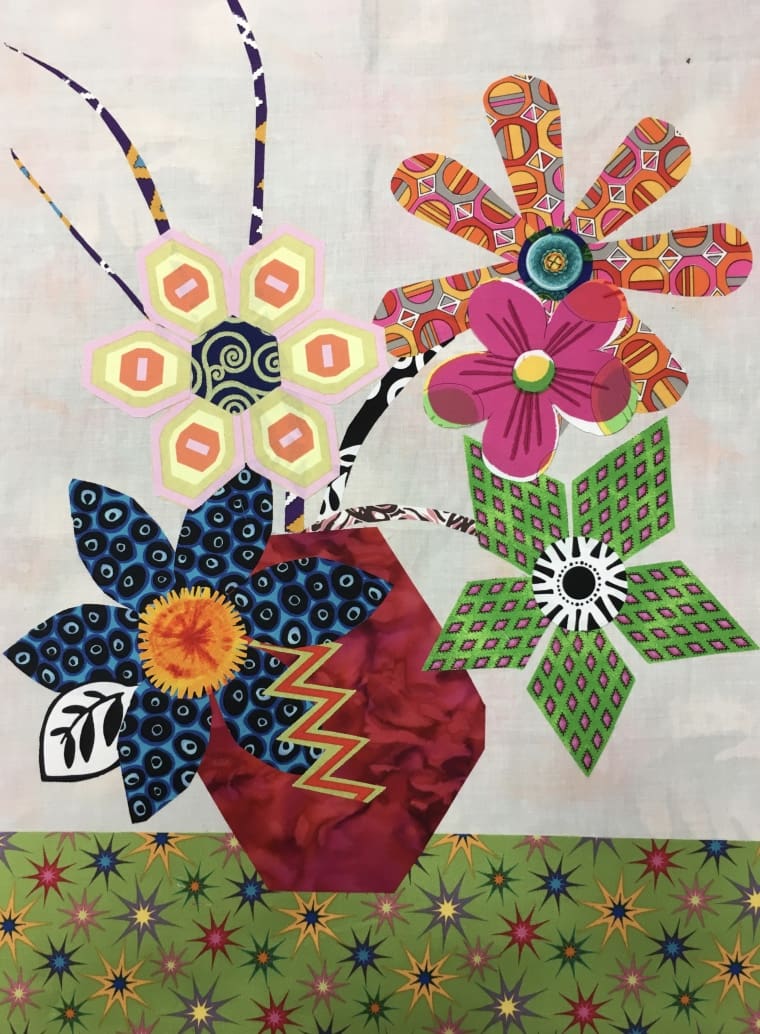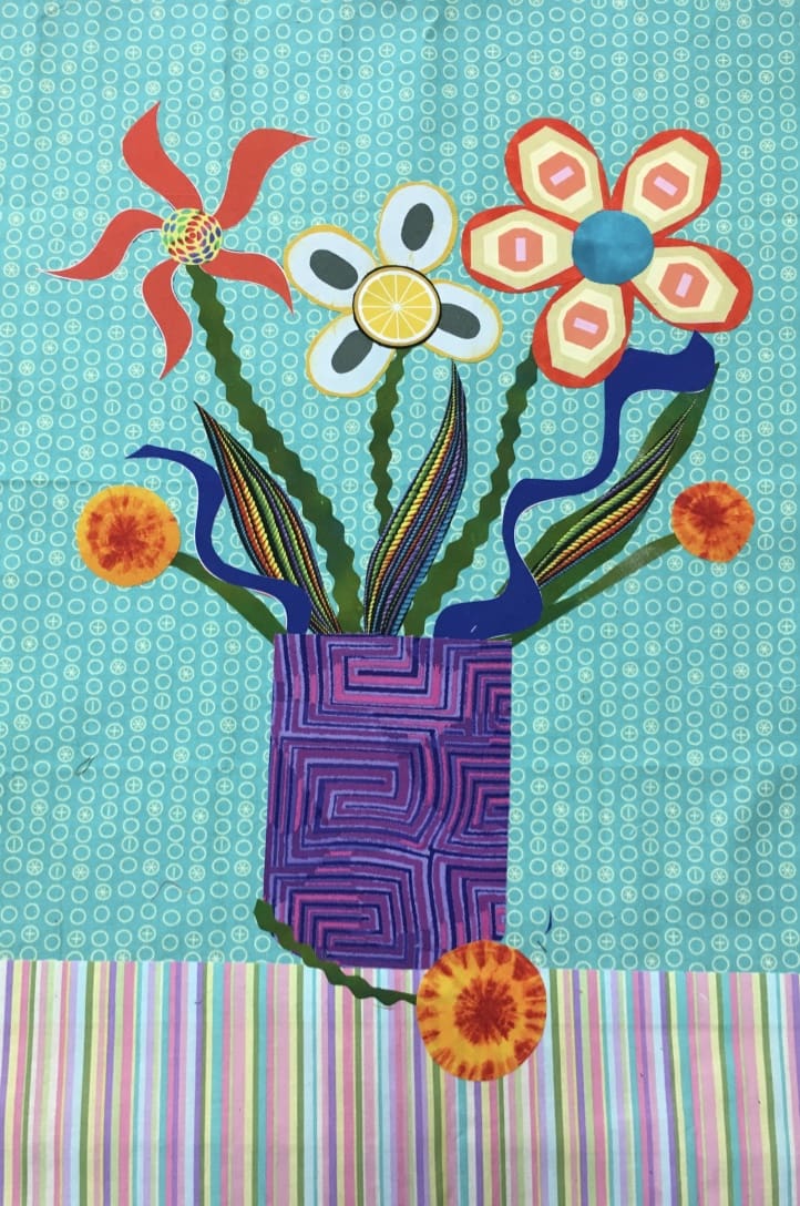 The students bring in a “table cloth” fabric and a background fabric. I provide the rest of the materials. You could use the technique to build other things—cars, owls, fish, and so on. But a floral bouquet is an excellent place to start.