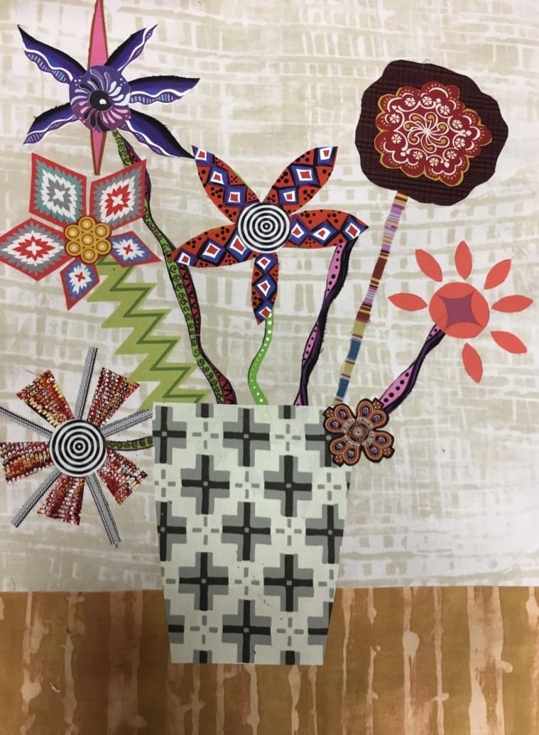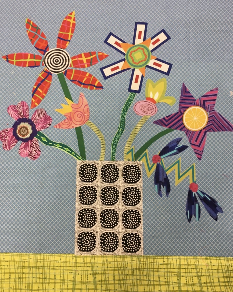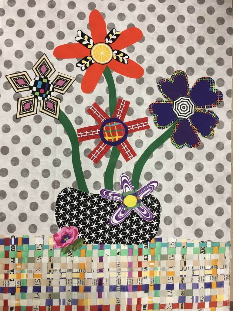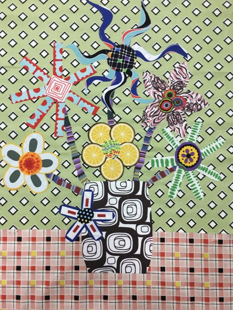 The students bring in a “table cloth” fabric and a background fabric. I provide the rest of the materials. You could use the technique to build other things—cars, owls, fish, and so on. But a floral bouquet is an excellent place to start.