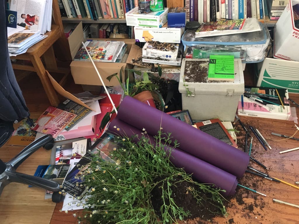 Meanwhile our crazy orange cat Kato is scrambling in and out of rooms seeking shelter. The older cat Speedy actually found a secret hiding place—don’t ask me where, it’s his secret. He didn’t come out for 48 hours.