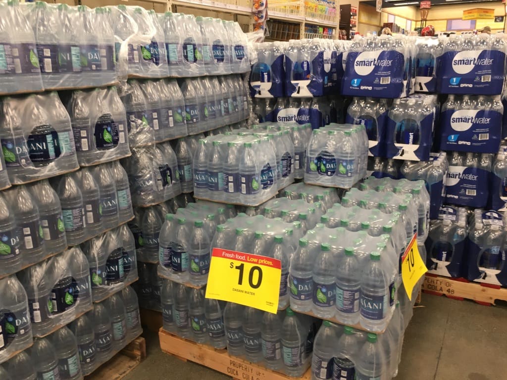 The store’s response is to just haul all their water out into the middle of the store—no reason to stock when the shelves will just empty again.