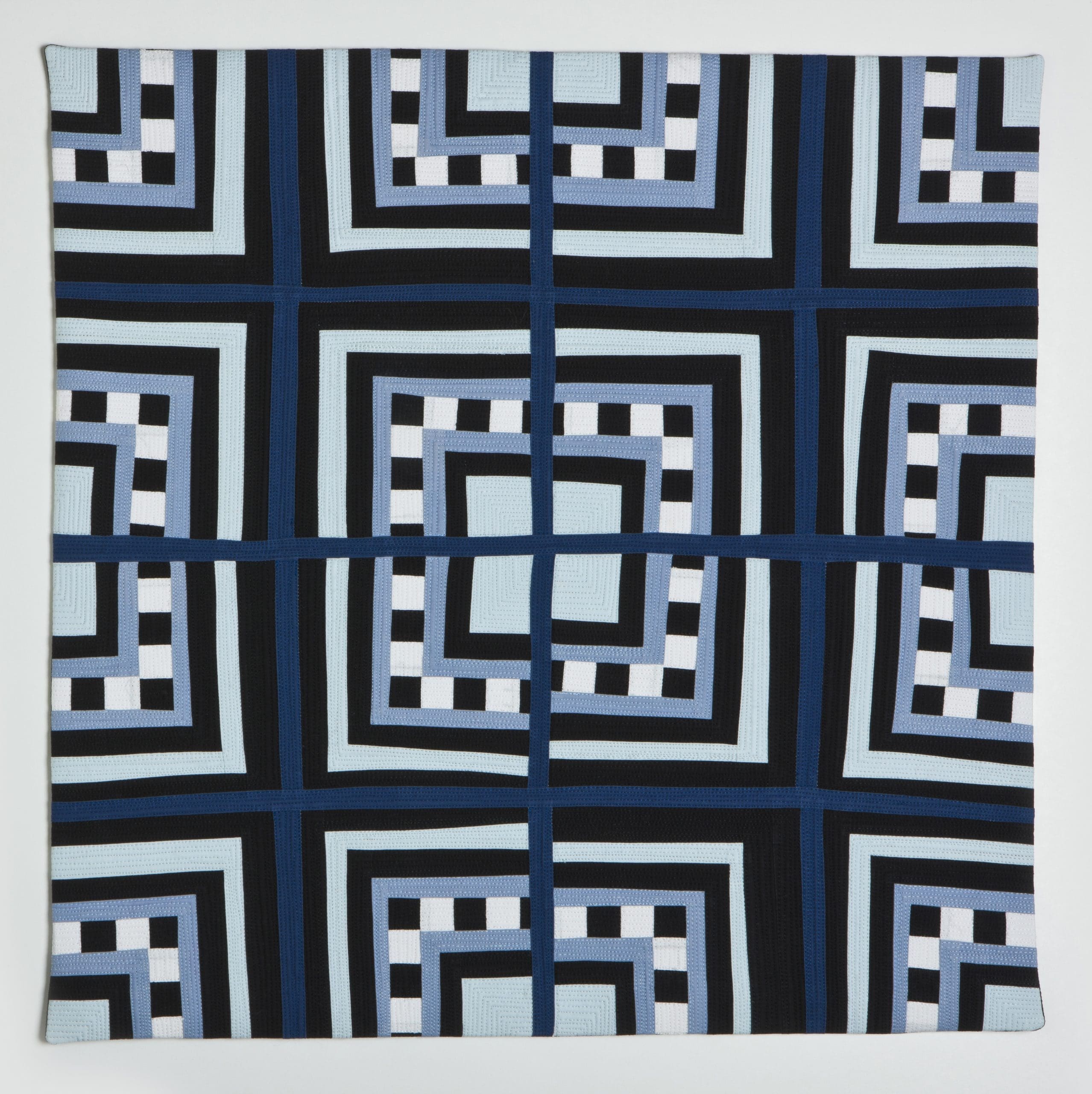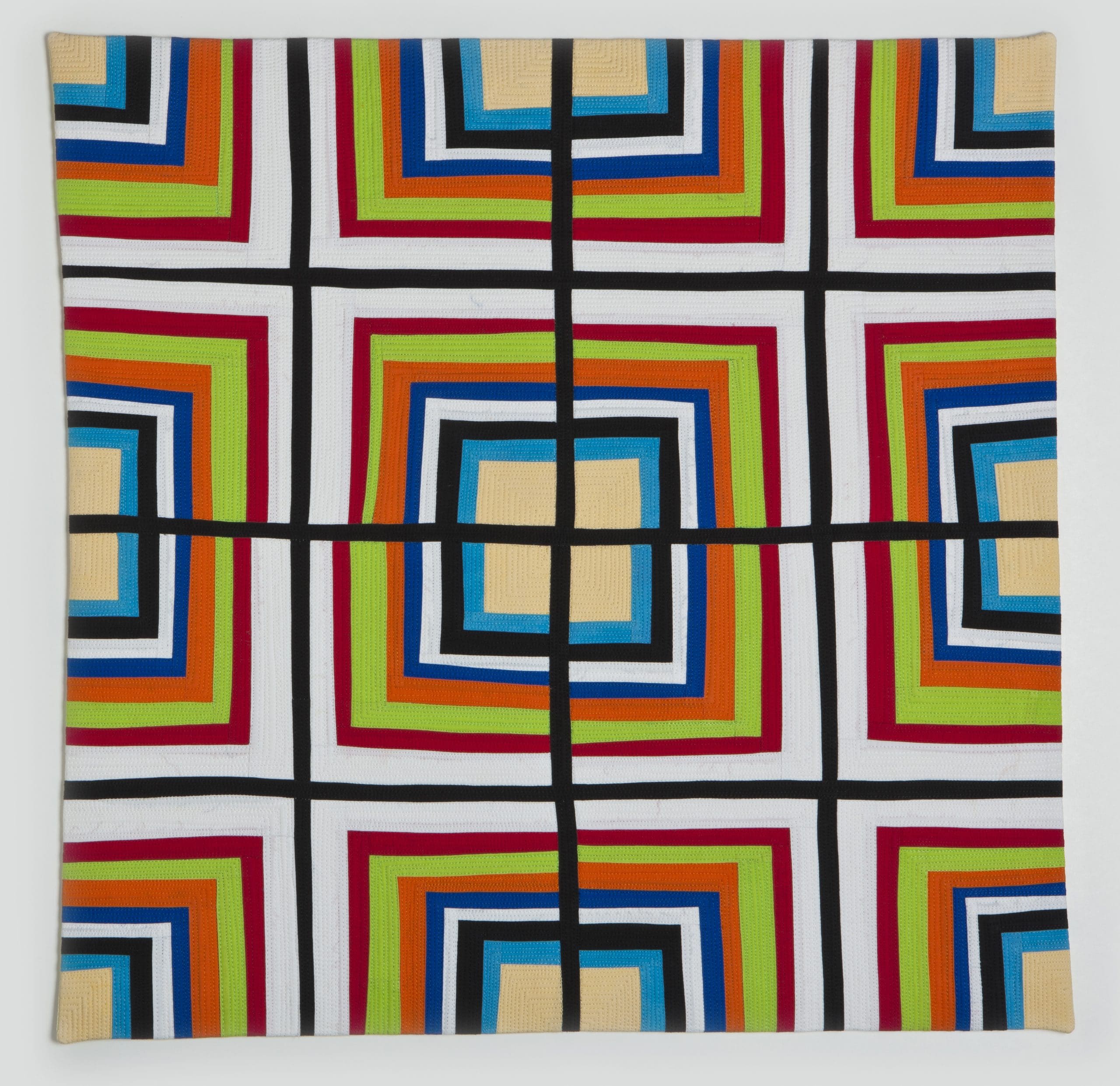 Instead of multiplying out the Crossed Square quilt block I often work with, I would simply blow up one Crossed Square block to be 24’’ x 24’’ in size. Or, as I did in two of the new pieces, shrink down the block and repeat it out in an assortment of colors and prints.