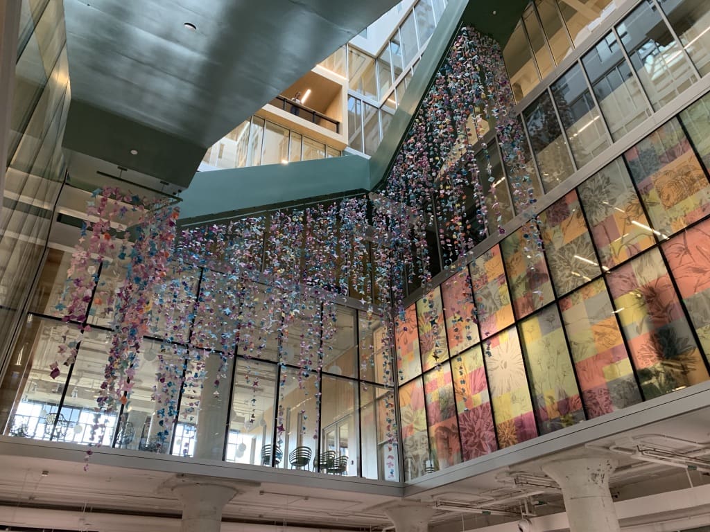 The community quilt was to built in this glass walled room over the course of three days.