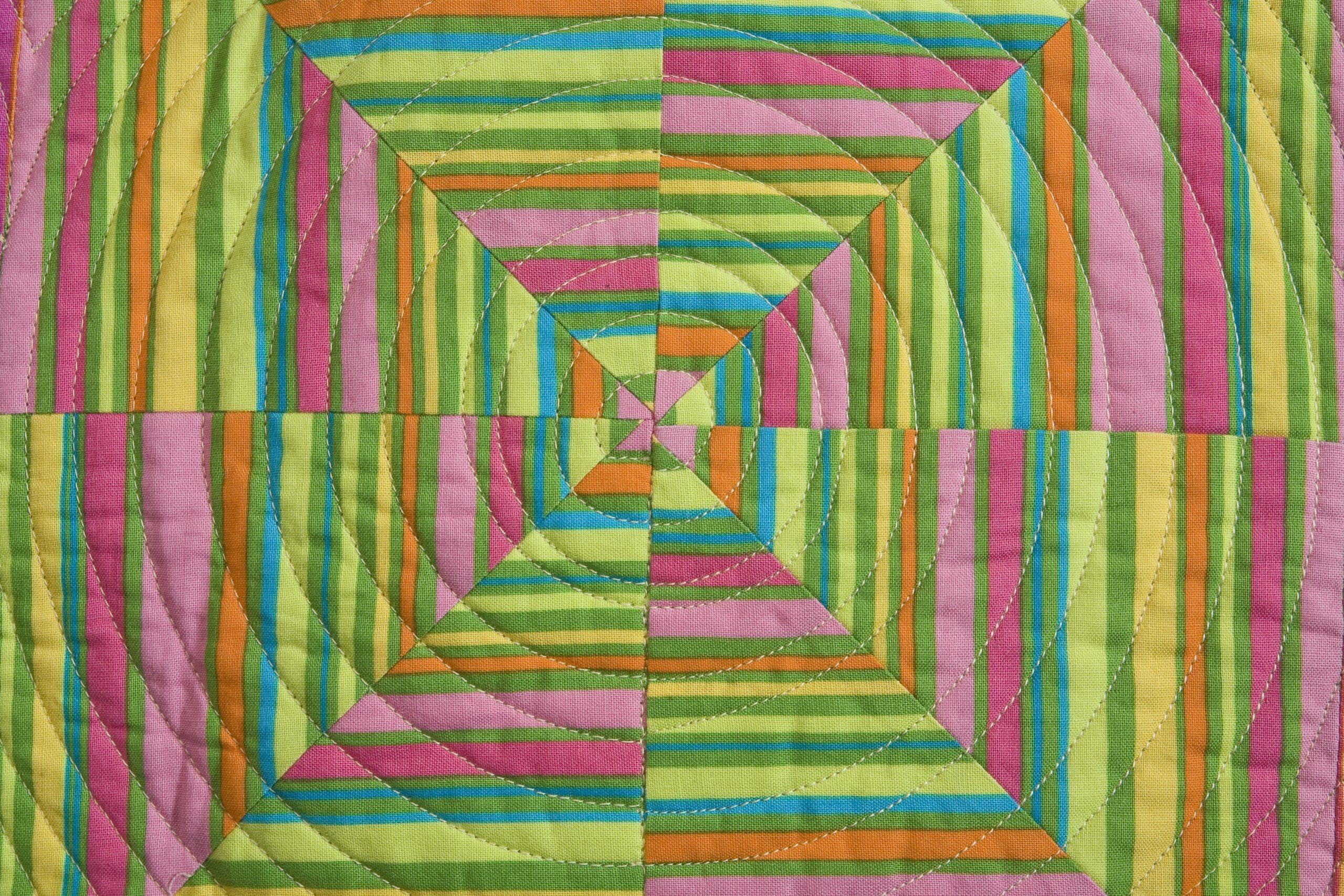In full disclosure, I had made this quilt many years ago. It is called Hypnotic Hypotenuse, and it features commercial stripes that have been fussy cut to create vibrating pinwheels. I have often thought that I need to make this quilt again using my own pieced stripes.