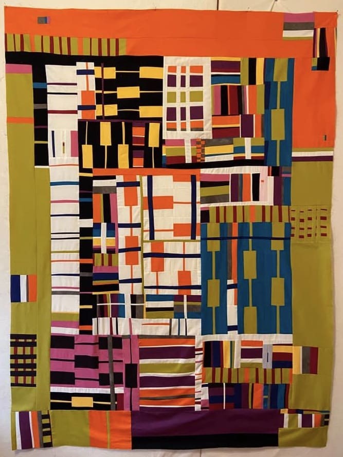 Using the traditional quilt block or other set of compositional lines (bridge, building, etc…) as your starting point we will enlarge and magnify the lines of the structure and use them as our skeleton for building a pieced composition. Students will also be introduced to methods for using printed fabrics to enhance their compositions. We will explore a variety of ways to create texture, pattern, and repetition in that space.